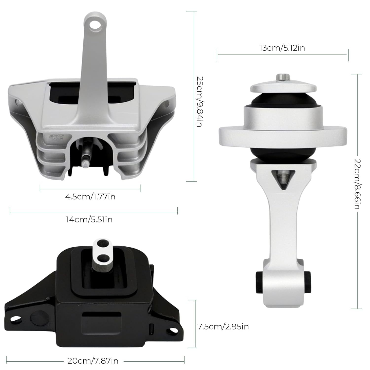 Este kit é composto por três peças essenciais: 1 suporte de motor direito, 1 suporte de torque frontal inferior e 1 suporte de transmissão esquerdo. Todos os componentes são feitos de alumínio de alta qualidade e borracha, oferecendo durabilidade superior e resistência a diversas condições de trabalho, o que garante um desempenho confiável ao longo do tempo.