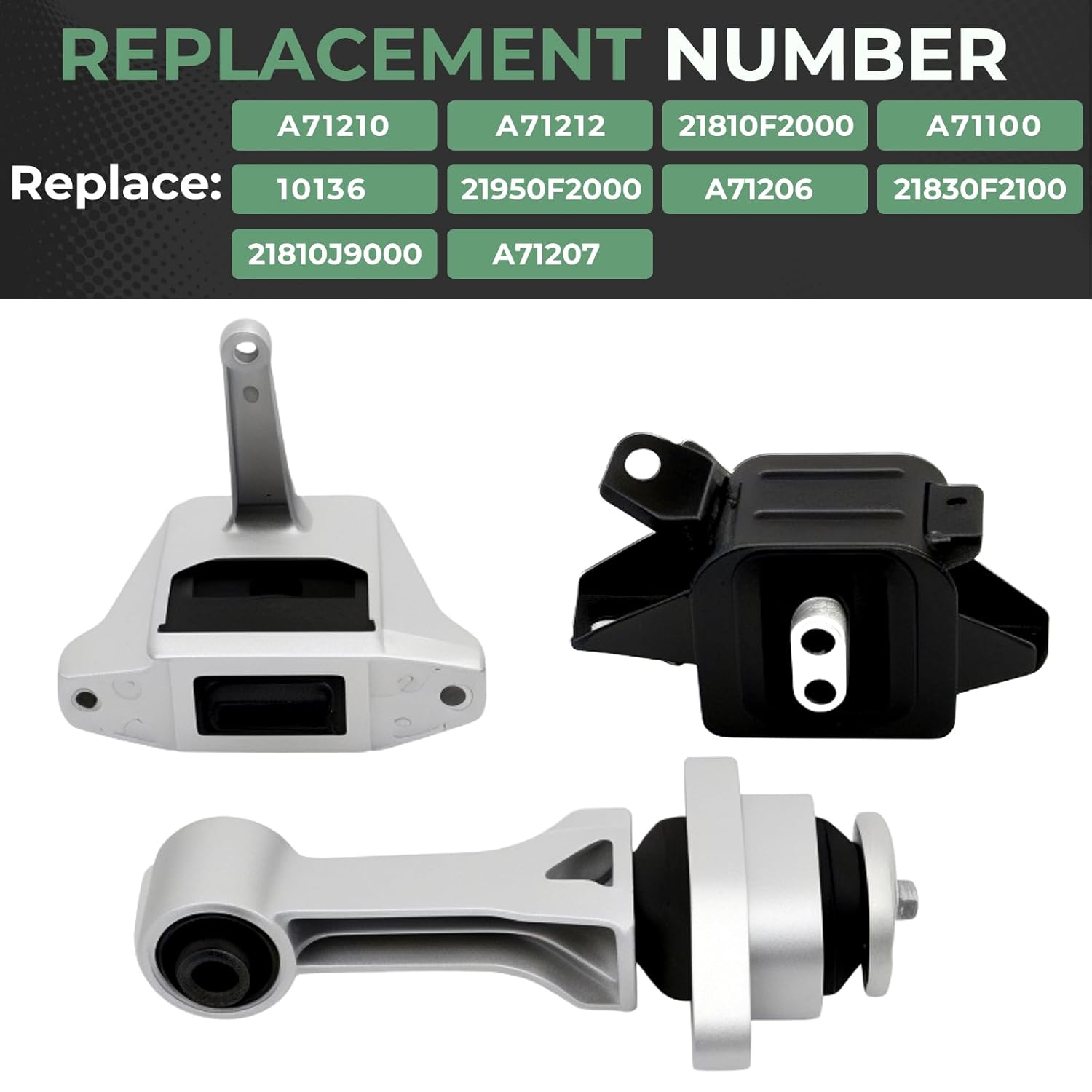 O conjunto de suportes de motor e transmissão 3Pcs é a solução ideal para quem busca qualidade e desempenho para veículos Hyundai e Kia. Compatível com modelos como o Hyundai Elantra 1.4T, 1.6T e 2.0L de 2017 a 2020, Elantra GT 1.6T e 2.0L de 2018 a 2020, além do IONIQ 1.6L de 2017 a 2022 e Kia Seltos 1.6L de 2021 a 2022, este kit é projetado para substituir as peças originais com os números de peça A71210, A71212, 21810F2000, 21810J9000, A71100, 10136, 21950F2000, A71206, A71207 e 21830F2100.