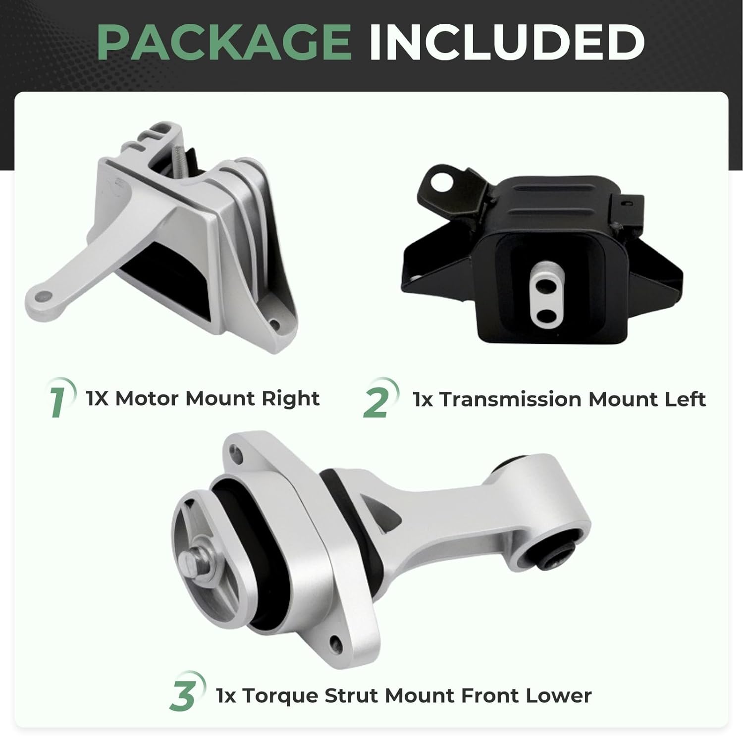 – Pacote Completo: Inclui 1 suporte de motor direito, 1 suporte de torque frontal inferior e 1 suporte de transmissão esquerdo.