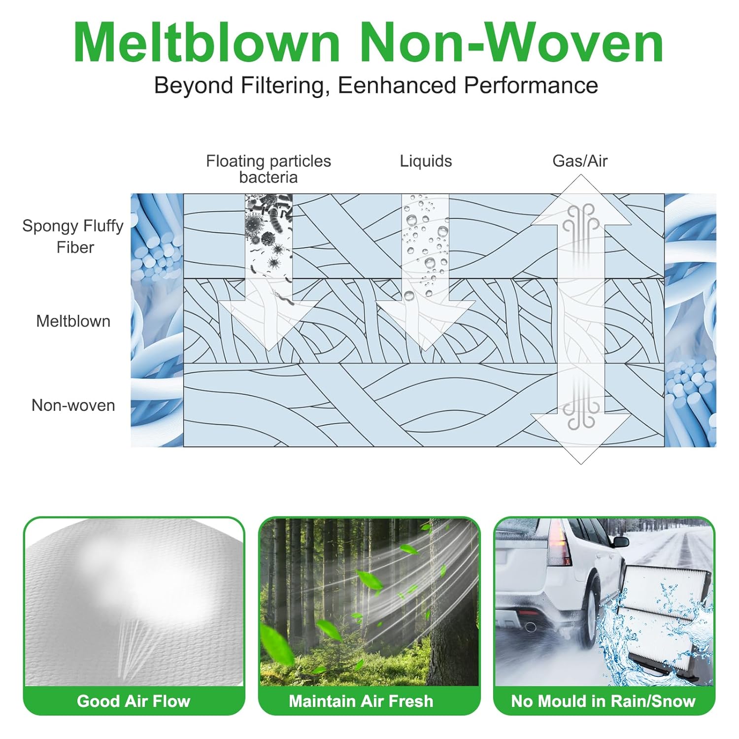 - Eficiência de Filtração: Com uma estrutura de microfibras, o filtro melt-blown é capaz de capturar partículas minúsculas, poeira, pólen e outras impurezas do ar, melhorando a qualidade do ar dentro do veículo e reduzindo substâncias nocivas, proporcionando uma experiência de condução mais confortável.