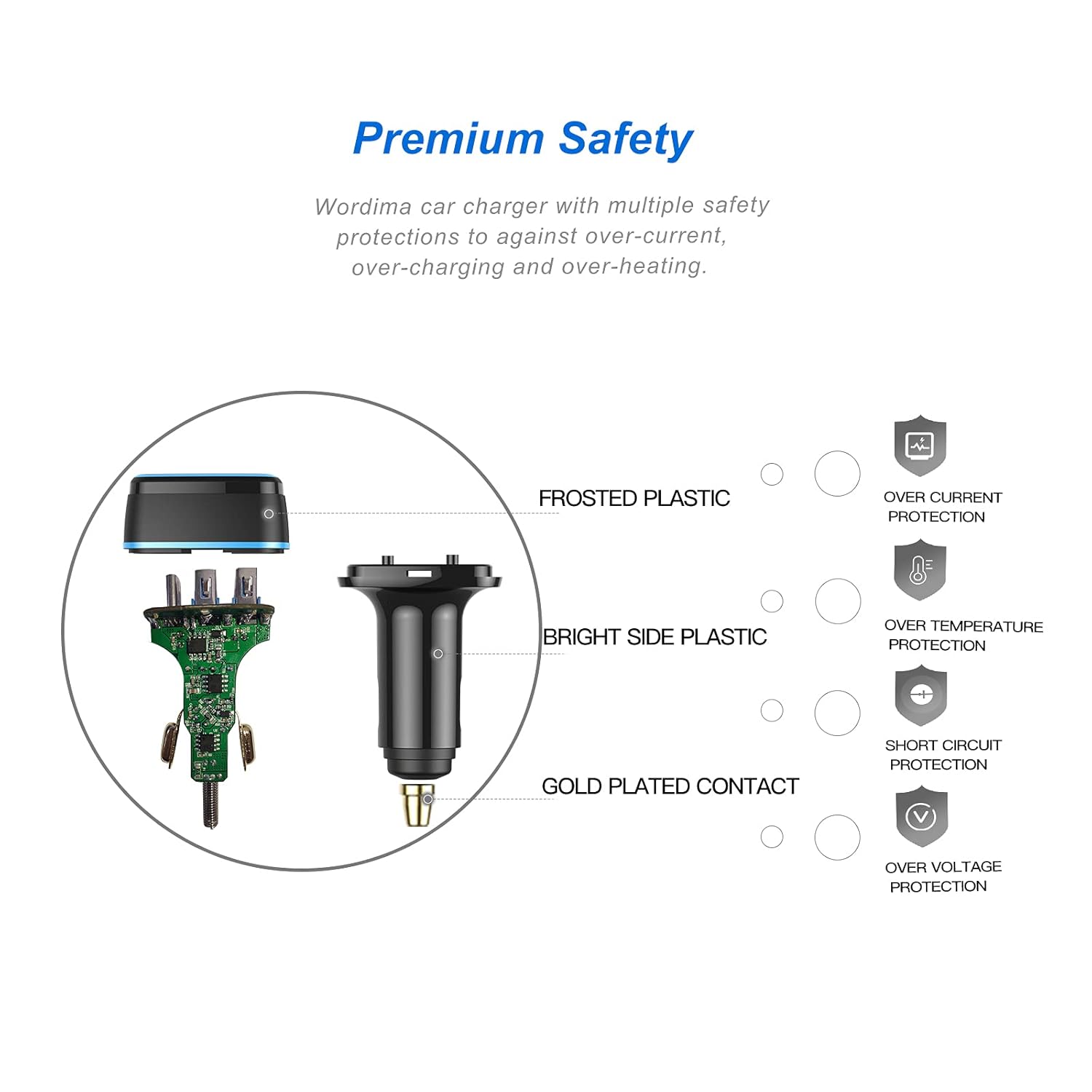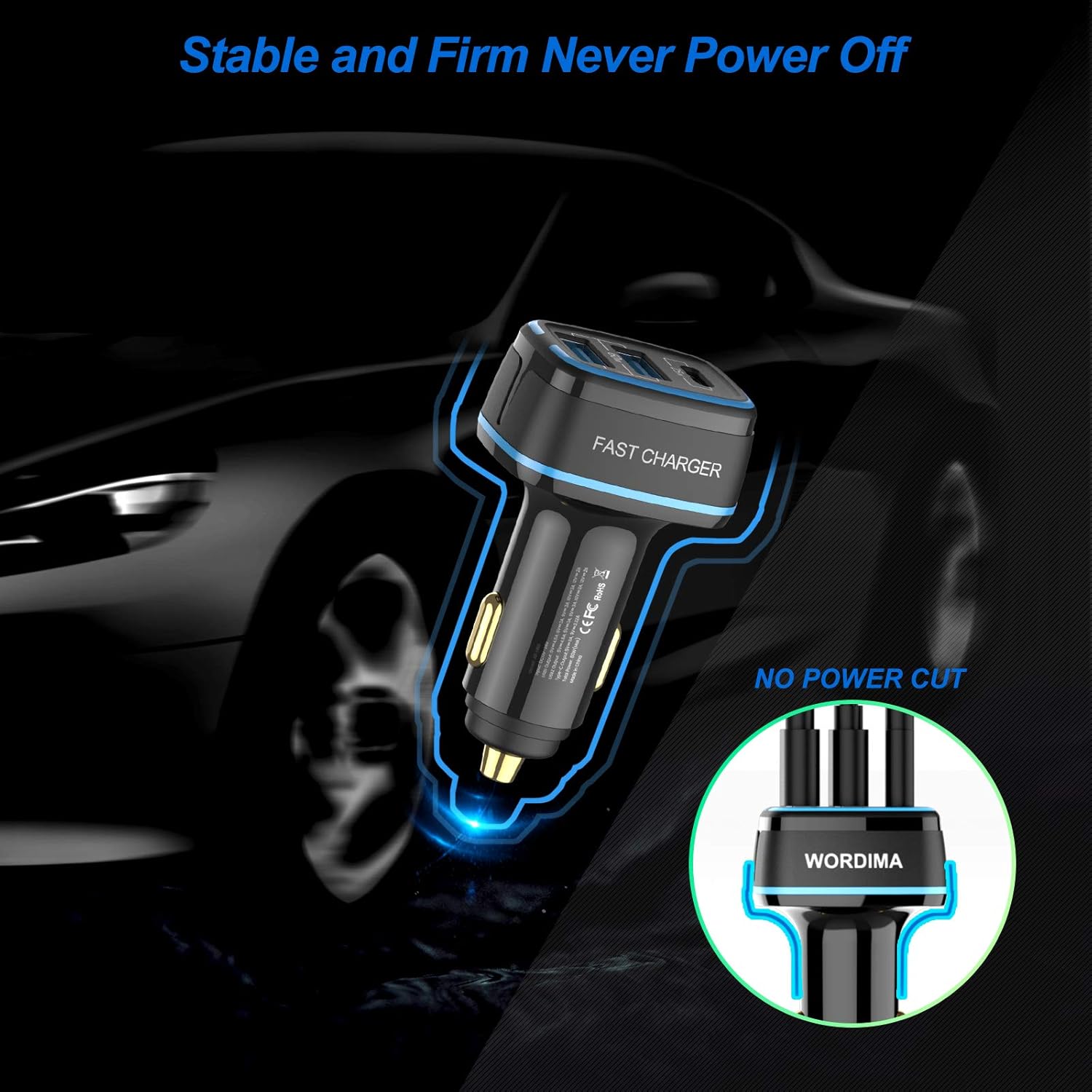 O adaptador de isqueiro WORDIMA vem equipado com proteções embutidas que garantem a segurança dos seus dispositivos contra sobrecargas, superaquecimento e curtos-circuitos. Com saídas de 2USB que oferecem 5V4.5A ou 5V3A, 9V3A, 10V2A, 12V1.5A (30W+30W Max) e uma saída Type-C de 5V3A, 9V2.22A, 12V2.08A (25W Max), você pode ter certeza de que seus dispositivos estão protegidos enquanto são carregados.