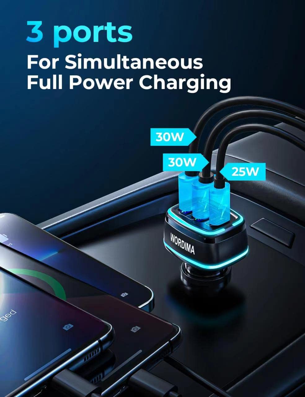 O Carregador Veicular Rápido 3Port WORDIMA é a solução definitiva para quem busca eficiência e rapidez no carregamento de dispositivos móveis enquanto está em movimento. Com tecnologia de carregamento independente para cada porta, este adaptador de isqueiro oferece uma potência máxima de 85W, distribuída em 30W + 30W + 25W. Isso significa que você pode carregar até três dispositivos simultaneamente, alcançando até 60% de carga em apenas 30 minutos. O porta USB-C, com suporte para Power Delivery (PD), é capaz de carregar até 80% em meia hora, garantindo que você nunca fique sem bateria durante suas viagens.