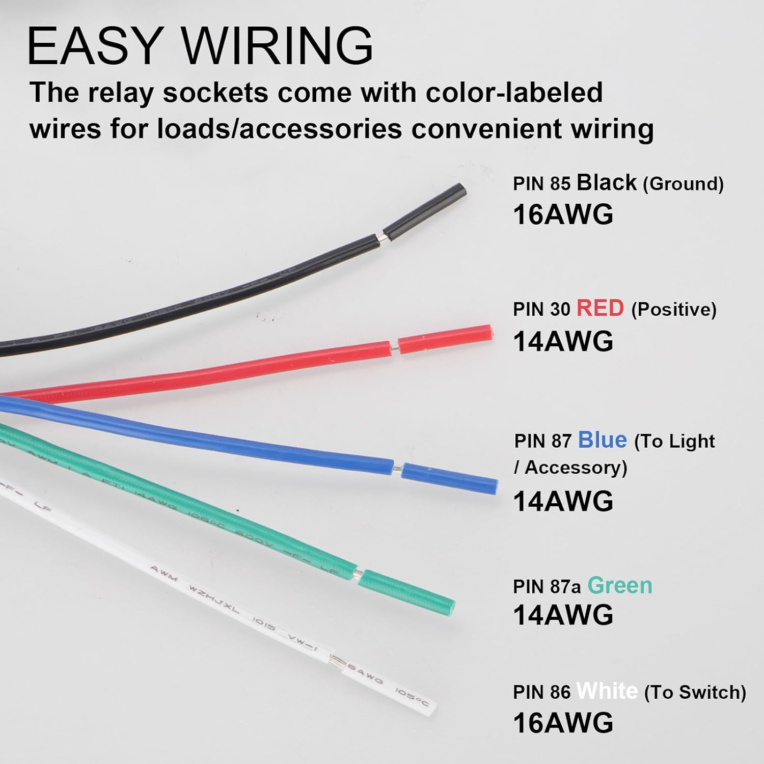 Cada relé vem equipado com um receptáculo de fusível embutido, que inclui um fusível de lâmina de 30A, proporcionando uma camada extra de proteção contra sobrecargas. Os fios de 14 AWG de alta resistência garantem que os contatos principais suportem as demandas elétricas sem comprometer a segurança. A codificação de cores dos fios facilita a instalação: preto para o aterramento (85), vermelho para a tensão DC (30), branco para o acionamento (86), azul para a saída N/O (87) e verde para o contato fechado (87a).