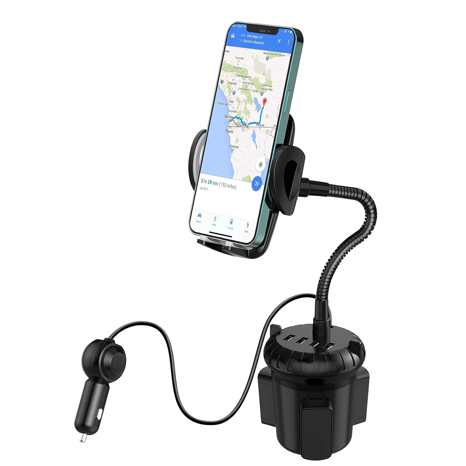 This is a much more sturdy cup holder than that car crane by bulbhead! It’s more sturdy, the pieces aren’t flimsy, it fits different cup holders easily. Another plus is that once you put it in your cup holder, it doesn’t move, your phone will be very secure. If you’re looking for a better car cupholder phone mount, this is the one to buy. Not to mention you can charge up to 4 devices because it has 4 USB ports!