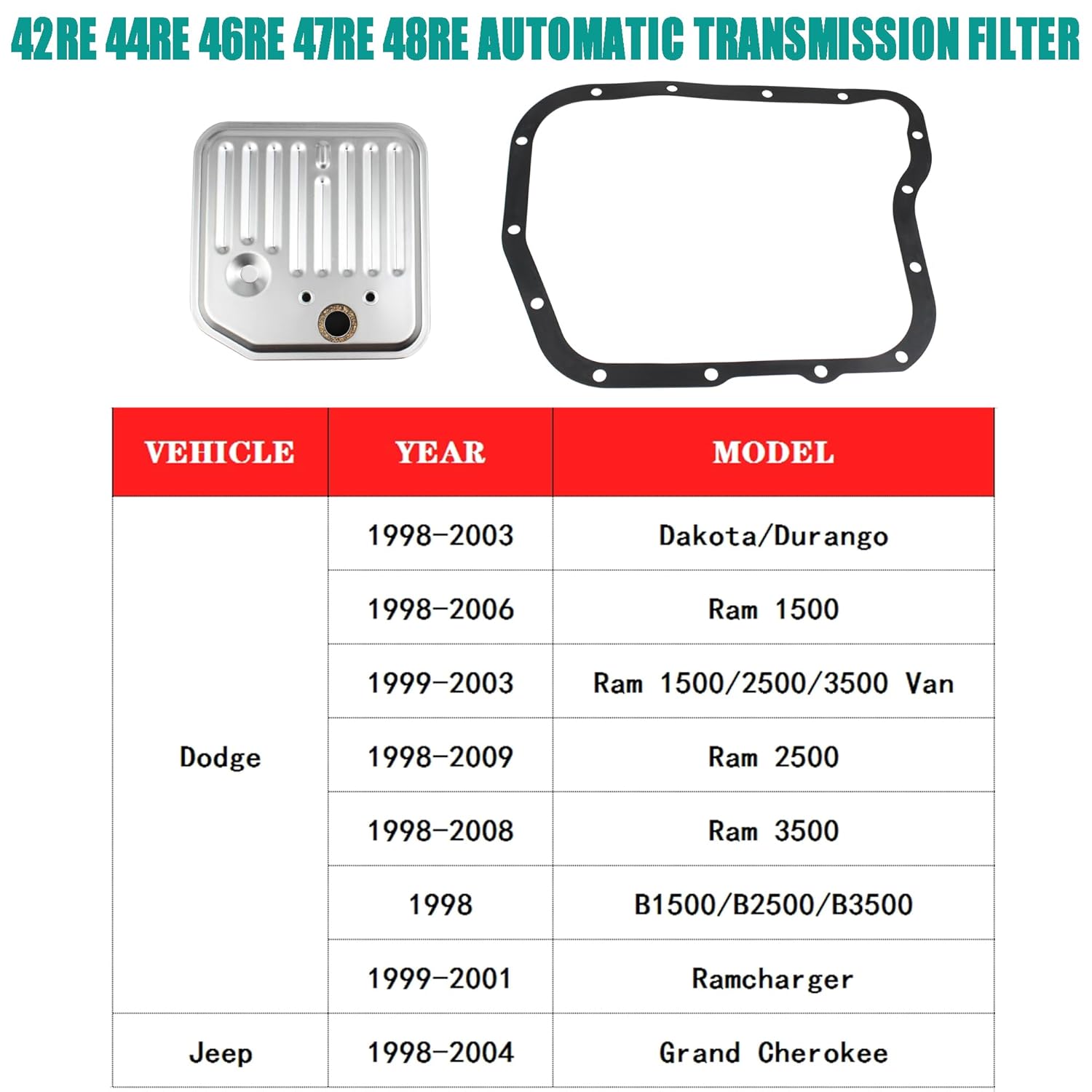 O Kit de Filtro de Transmissão Automática 42RE 44RE 46RE 47RE 48RE é a solução ideal para quem busca manter a eficiência e a durabilidade da transmissão de veículos Dodge e Jeep fabricados entre 1998 e 2009. Este kit é projetado para filtrar o óleo e remover impurezas dos fluidos de transmissão, garantindo que o sistema funcione de maneira suave e eficiente. Ao manter os fluidos de transmissão limpos, você evita o entupimento do corpo da válvula e de outras partes essenciais, prolongando a vida útil do seu conjunto de transmissão.