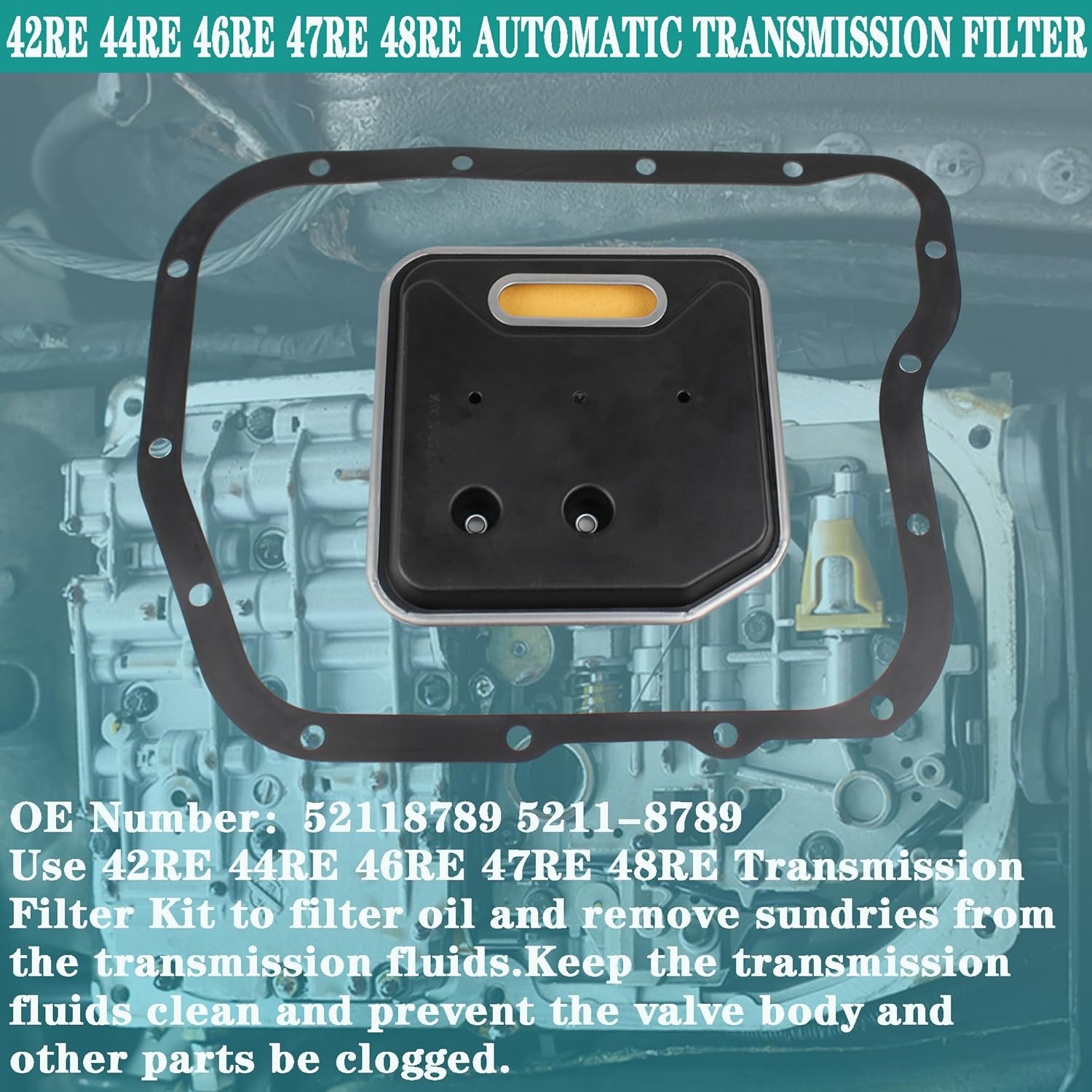 O Kit de Filtro de Transmissão Automática 42RE 44RE 46RE 47RE 48RE é a solução ideal para quem busca manter a eficiência e a durabilidade da transmissão de veículos Dodge e Jeep fabricados entre 1998 e 2009. Este kit é projetado para filtrar o óleo e remover impurezas dos fluidos de transmissão, garantindo que o sistema funcione de maneira suave e eficiente. Ao manter os fluidos de transmissão limpos, você evita o entupimento do corpo da válvula e de outras partes essenciais, prolongando a vida útil do seu conjunto de transmissão.