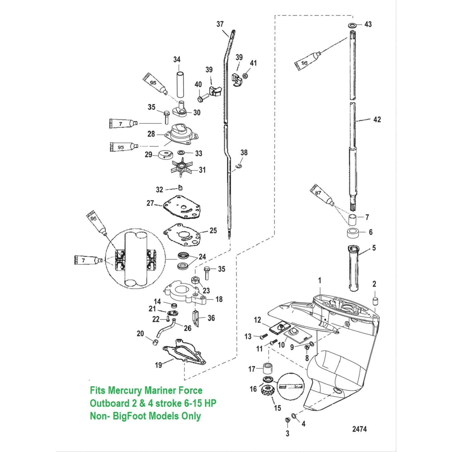 Kit de Reparo de Impulsor de Bomba d’Água 46-42089A5 com Carcaça para motores de popa Mercury, Mariner, Sears e Force de 6, 8, 9.9, 10 e 15 HP. Este kit inclui peças de alta qualidade para substituição, garantindo um desempenho eficiente e confiável do motor. Com fácil instalação, ele melhora a circulação de água, prevenindo superaquecimento e danos ao motor. Ideal para manutenção de embarcações, oferece durabilidade e resistência, assegurando que seu motor funcione de maneira otimizada.