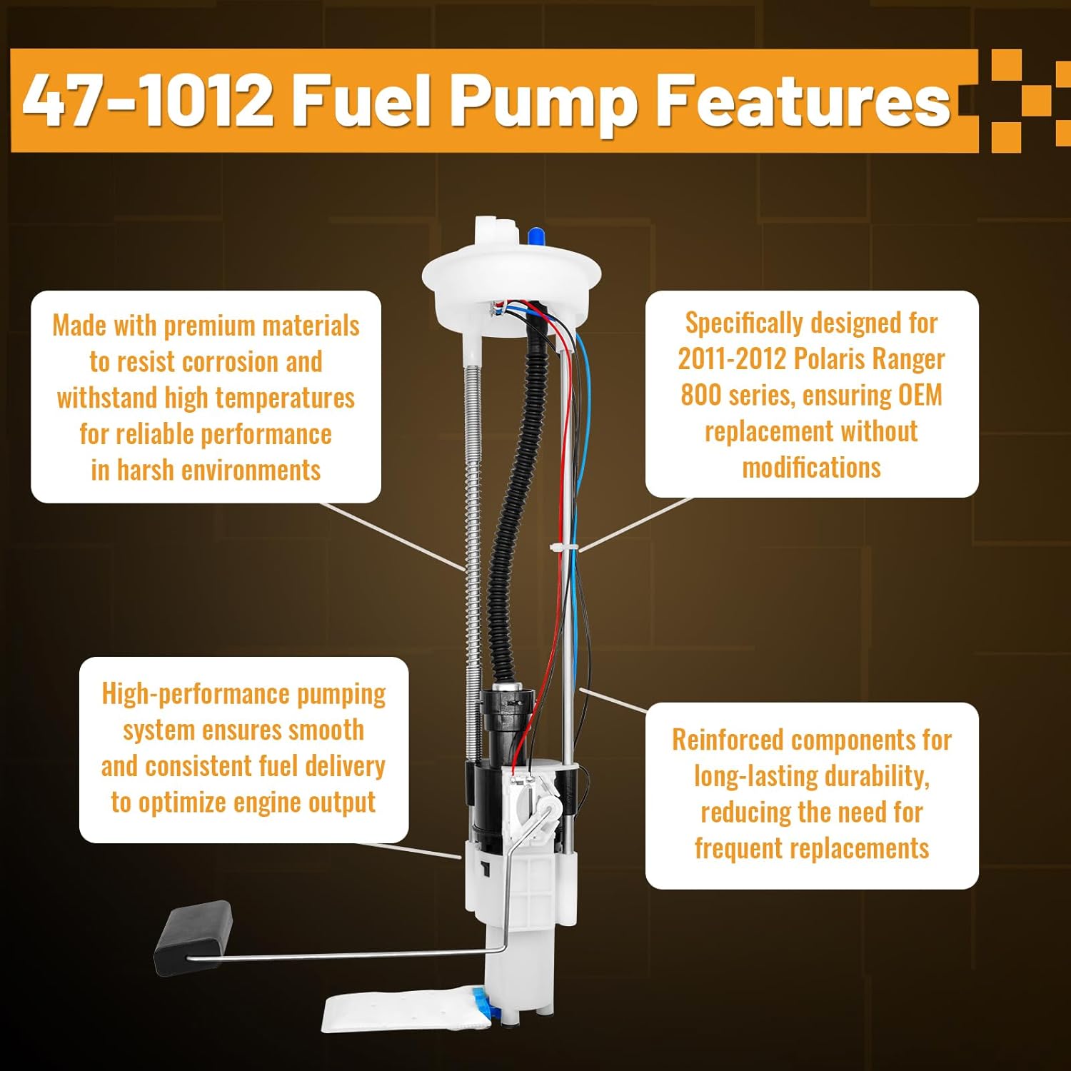 - Compatibilidade: A Bomba de Combustível 47-1012 é compatível com os modelos Polaris Ranger 4X4 800 EFI (2011-2012), Ranger Crew 800 4×4 EFI EPS (2011-2012) e Ranger XP 800 4×4 EFI EPS (2012).