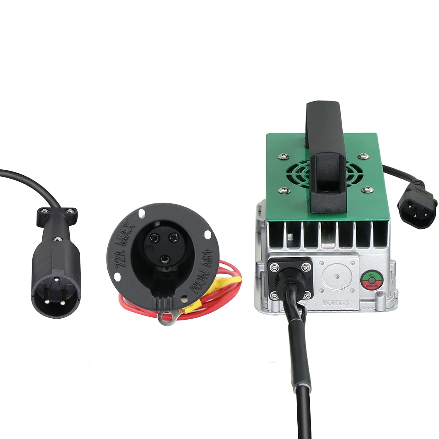 Além disso, o carregador vem com todos os acessórios necessários para instalação, incluindo um soquete de carregador, um plugue de carregador e um fio de intertravamento de carga. Isso torna o processo de configuração simples e conveniente, permitindo que você comece a usar seu carrinho de golfe rapidamente.