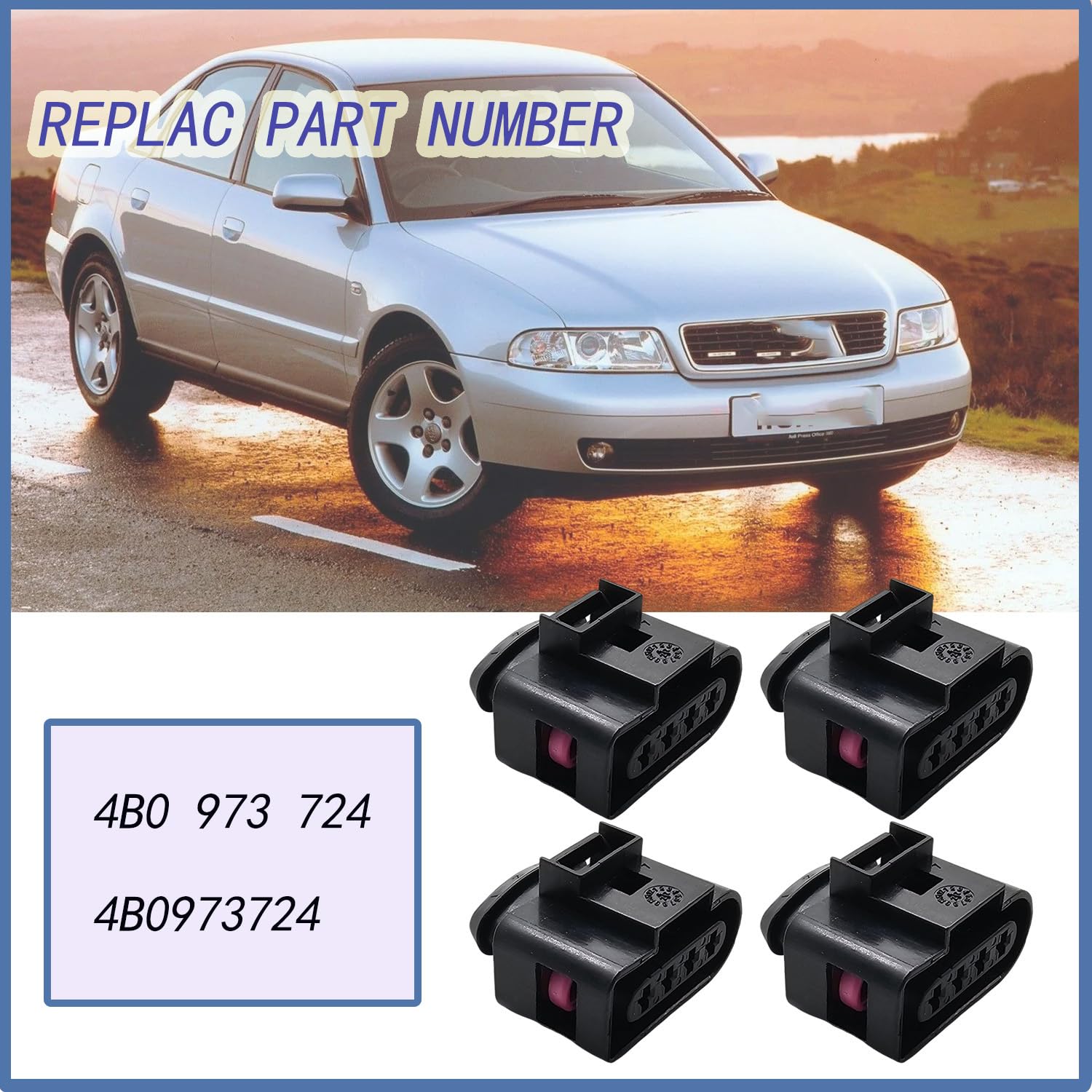 Kit de Reparação de Conectores de Bobina de Ignição com 4 Peças, compatível com Audi e VW, substitui o código 4B0 973 724. Inclui conectores femininos de 4 vias e uma ferramenta de ajuste de espaço de 0,3 cm. Ideal para restaurar conexões elétricas danificadas, garantindo desempenho confiável do motor. Fácil instalação e durabilidade, proporcionando uma solução econômica para problemas de ignição.
