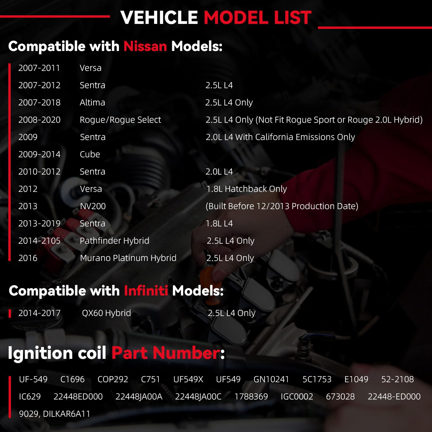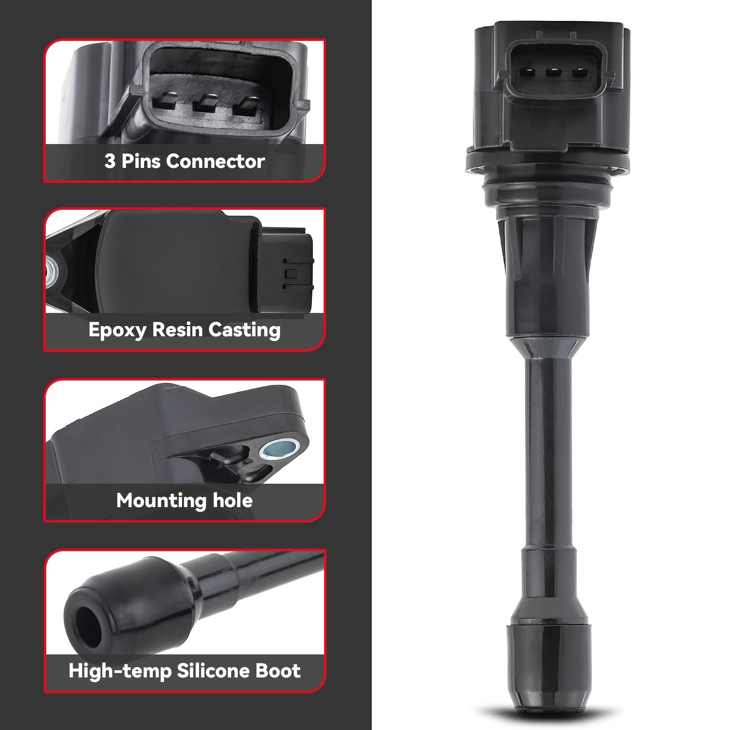 Aumente o desempenho do seu veículo com o nosso conjunto de 4 bobinas de ignição de alta performance e 4 velas de ignição de irídio, compatíveis com uma ampla gama de modelos, incluindo o Nissan Cube (09-14), Altima (07-18), Rogue Select (08-20), QX60 (14-17), Pathfinder, Murano 2.5L (07-19) e Sentra (1.8L, 2.5L, 2.0L de 07-12). Este kit é projetado para oferecer uma ignição mais eficiente, resultando em melhor economia de combustível e desempenho geral do motor.