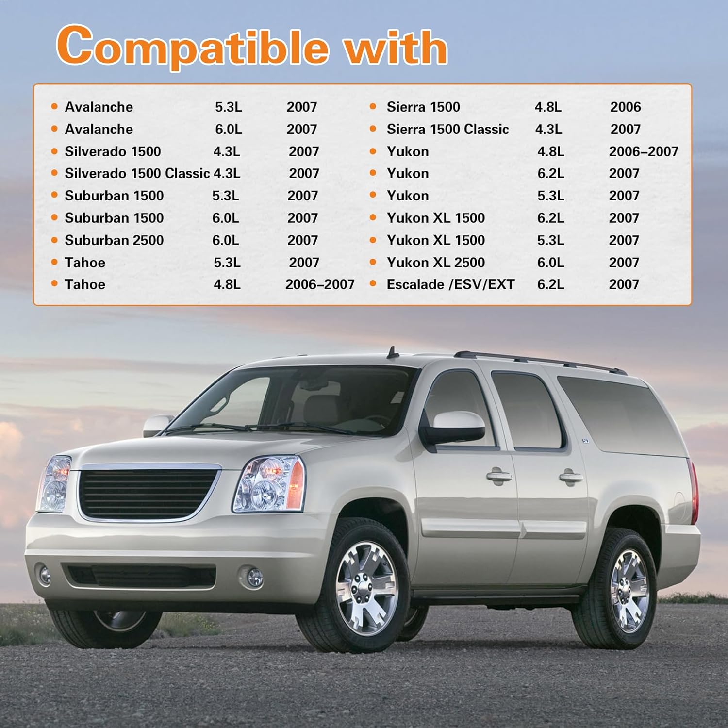 • 【Fitment】: Compatível com Chevrolet Avalanche 2007 5.3L/6.0L, Silverado 1500/1500 Classic 2007 4.3L, Suburban 1500 2007 5.3L/6.0L, Suburban 2500 2007 6.0L, Tahoe 2007 5.3L, Tahoe 2006-2007 4.8L, Yukon 2007 4.8/5.3L/6.2L, Yukon XL 1500 2007 5.3L/6.2L, Yukon XL 2500 2007 6.0L, Escalade/ESV/EXT 2007 6.2L. Garantindo encaixe perfeito e compatibilidade total com seu veículo.
