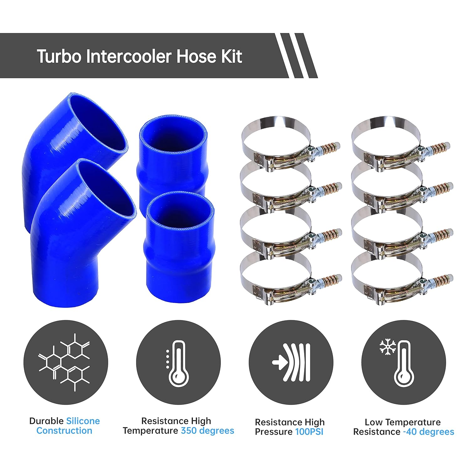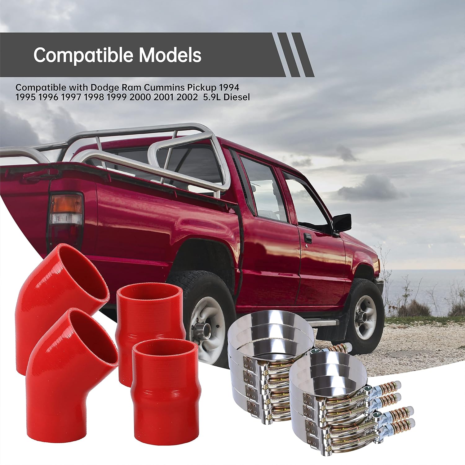 O Kit de Mangueiras de Intercooler de Silicone de 5.9L com Braçadeiras, compatível com as picapes Dodge Ram 5.9L Diesel de 1994 a 2002, é a escolha ideal para quem busca desempenho e durabilidade em seu veículo. Este kit é projetado para suportar as exigências de alta temperatura e pressão, garantindo que seu motor funcione de maneira eficiente e confiável.