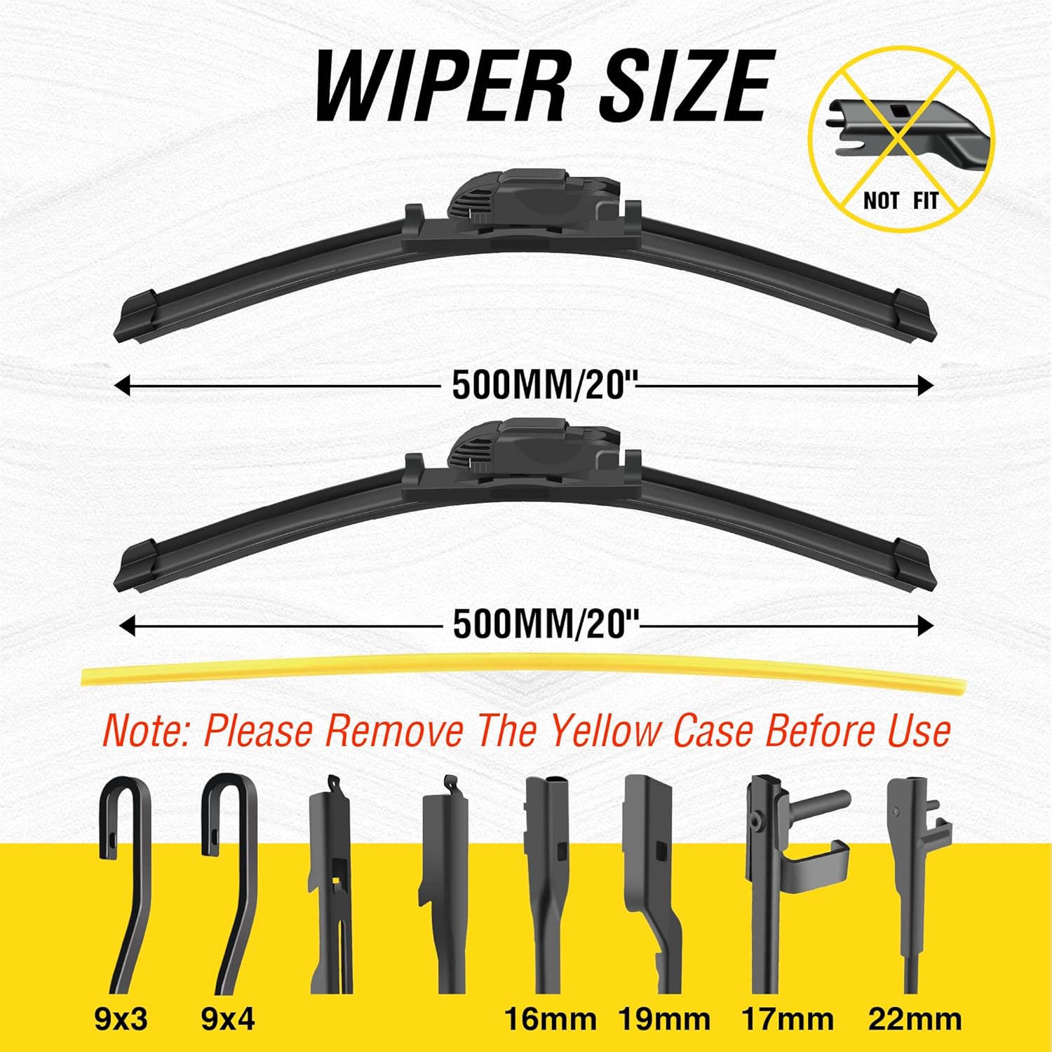 Fit: Inclui palhetas de 20 polegadas + 20 polegadas. Compatível com braços de limpador Hook/Top Lock 16MM ou 19MM/Pinch Tab/Side Lock. (Não compatível com D-Top Lock ARM).
