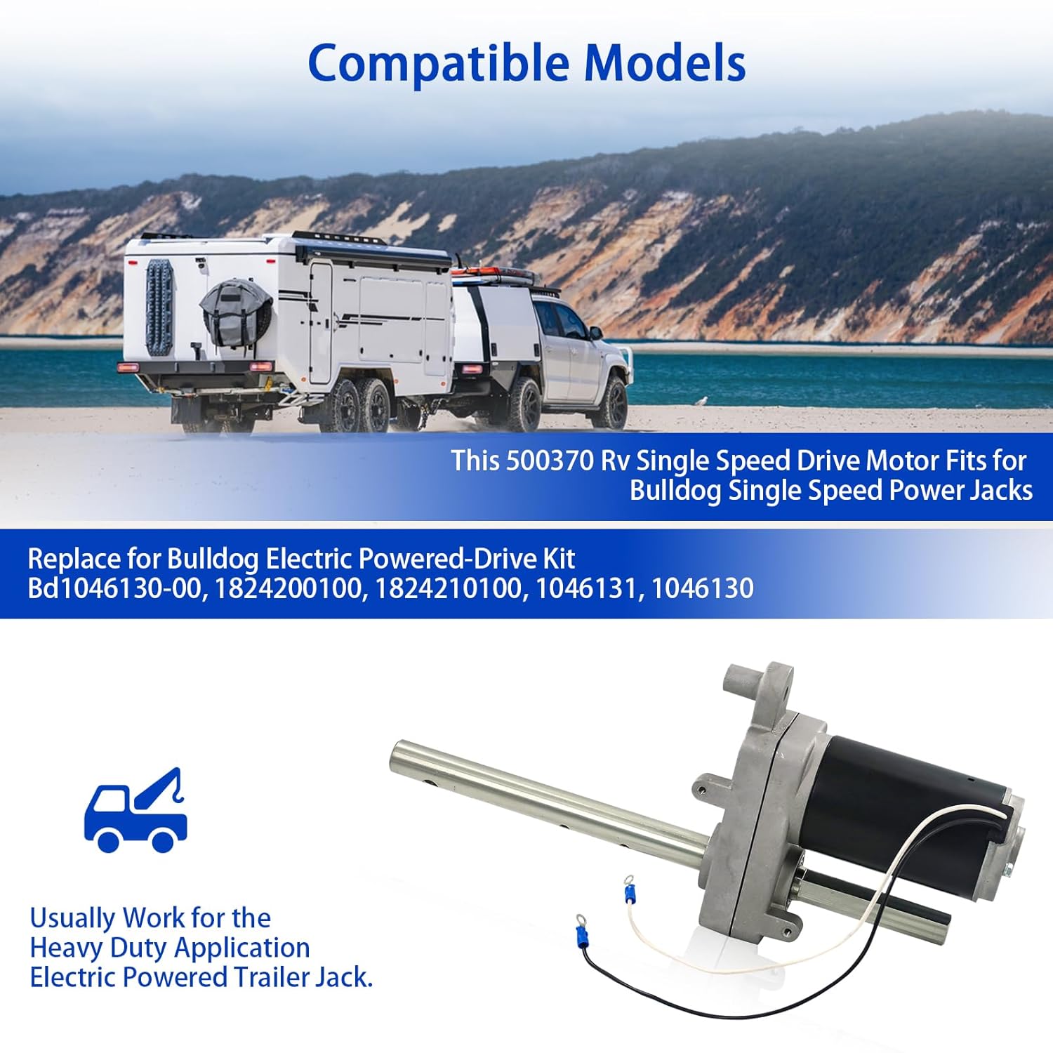 O motor elétrico de direção de velocidade única 500370 é a solução ideal para quem busca eficiência e confiabilidade em sistemas de jacks elétricos para trailers e veículos recreativos. Compatível com os jacks elétricos Bulldog de velocidade única, este motor é um substituto perfeito para os kits de acionamento elétrico Bulldog, incluindo os números de peça 1824200100, 1824210100 e BD1046130-00.