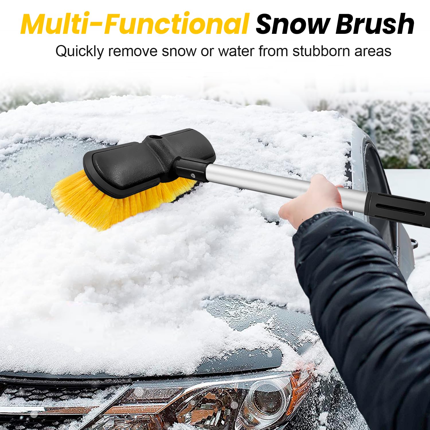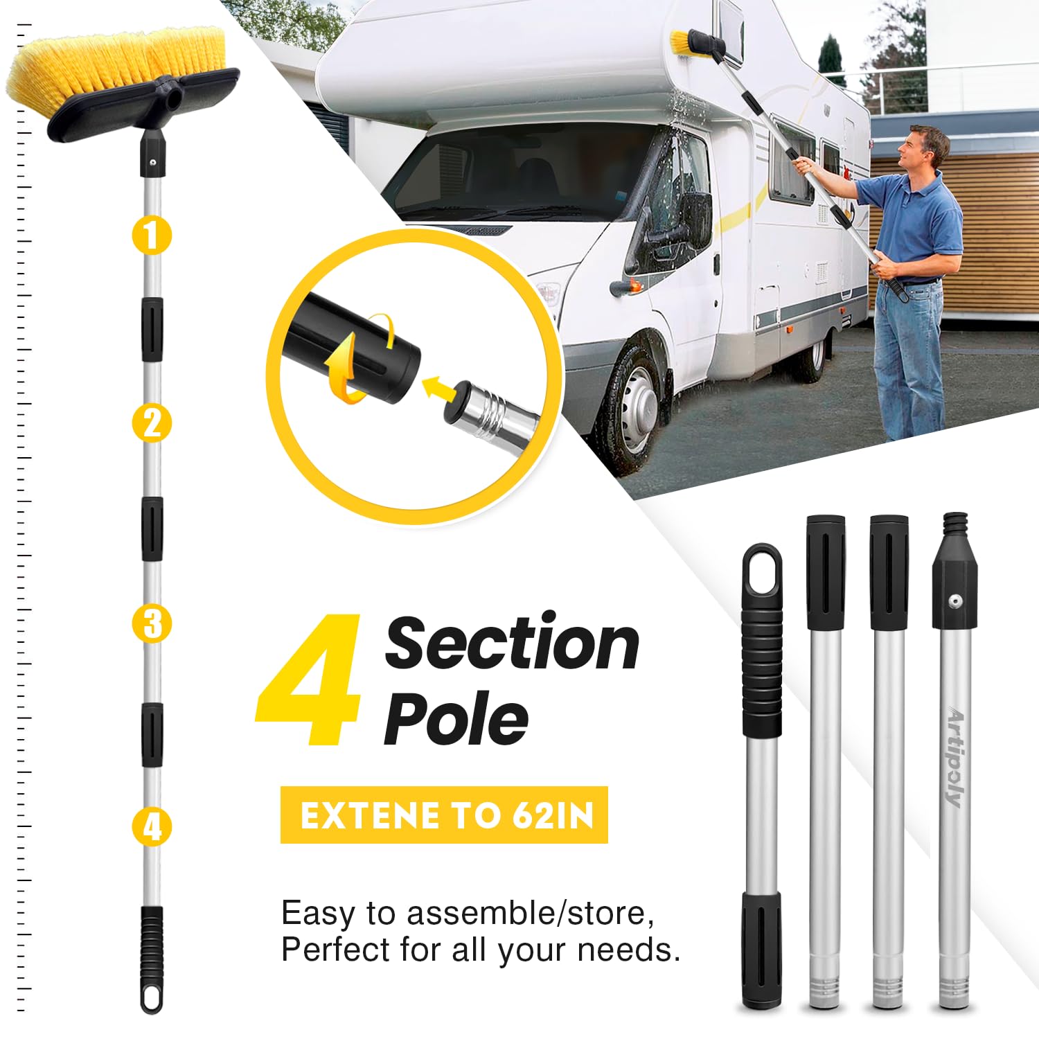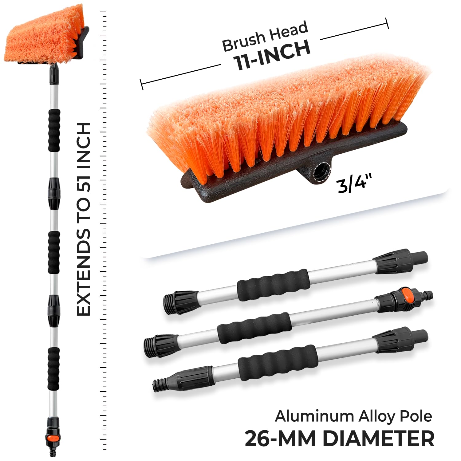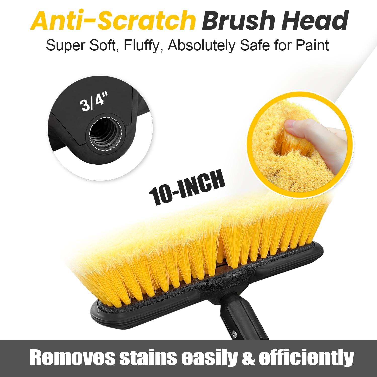 As cerdas da escova são extremamente macias, compostas por uma camada externa de TPR (borracha termoplástica), que protege a pintura do seu carro contra arranhões e danos. Isso significa que você pode limpar seu veículo com confiança, sabendo que a escova não comprometerá a integridade da superfície. O design destacável da escova permite que você combine até três hastes, alcançando um comprimento total de 51″, ideal para diferentes necessidades de uso, desde caminhões até veículos recreativos (RVs). As duas empunhaduras em espuma proporcionam um controle adicional, garantindo que você possa manusear a escova com segurança, mesmo com as mãos molhadas.