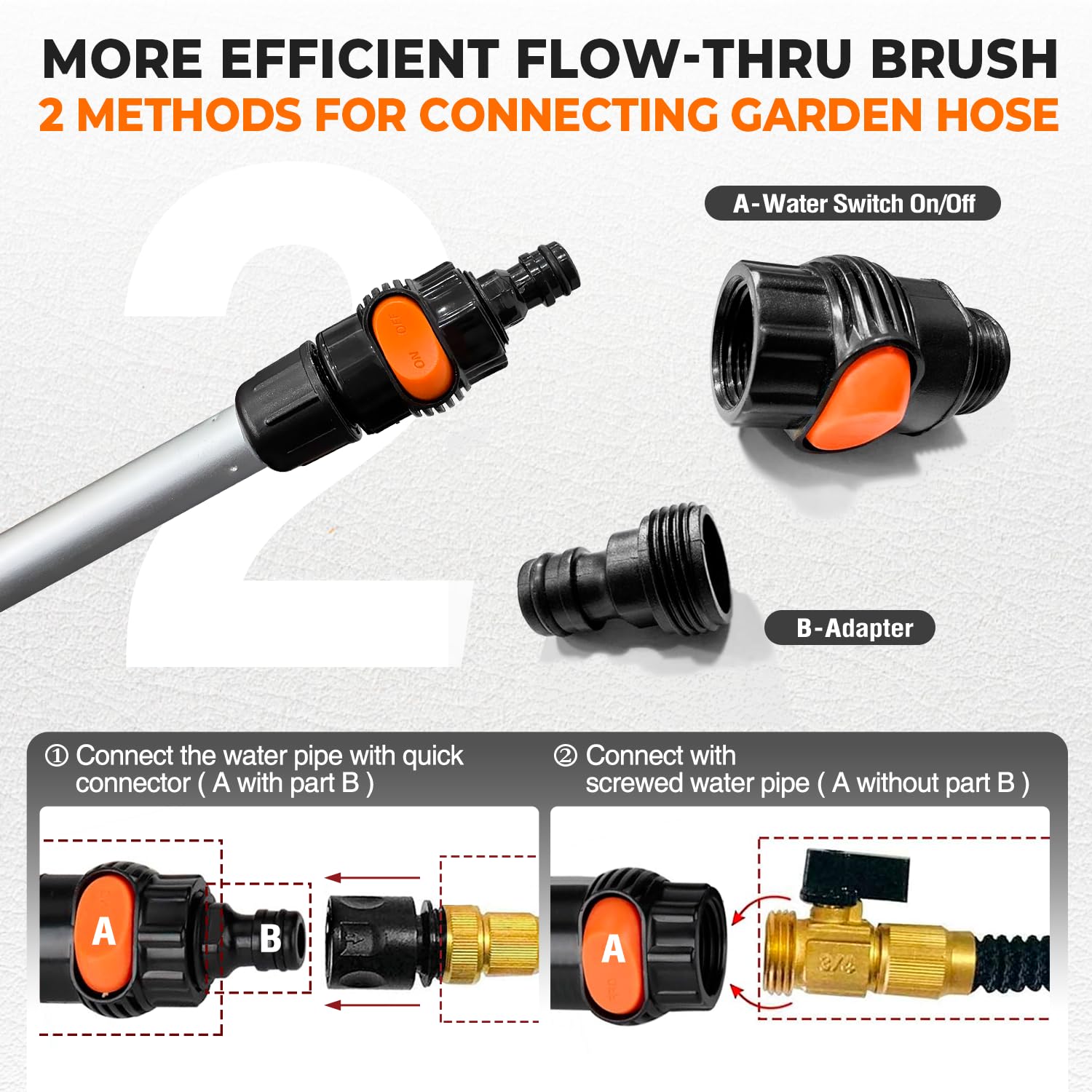 Sorry to say this is not the one I want. The weight of garden hose broke the plastic threads right out of the on off switch. SO I removed the switch and screwed it directly to the pole and I found out the water sprays out like a jet from the top of the brush, not thru the brush.