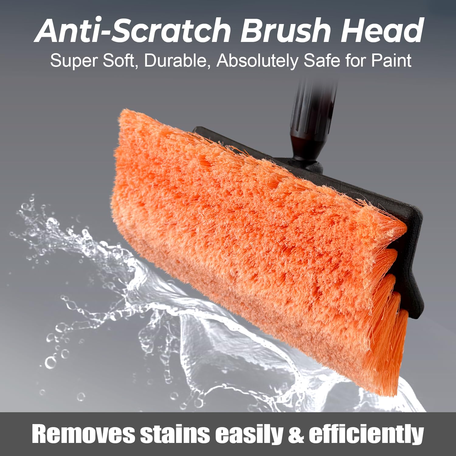 As cerdas da escova são extremamente macias, compostas por uma camada externa de TPR (borracha termoplástica), que protege a pintura do seu carro contra arranhões e danos. Isso significa que você pode limpar seu veículo com confiança, sabendo que a escova não comprometerá a integridade da superfície. O design destacável da escova permite que você combine até três hastes, alcançando um comprimento total de 51″, ideal para diferentes necessidades de uso, desde caminhões até veículos recreativos (RVs). As duas empunhaduras em espuma proporcionam um controle adicional, garantindo que você possa manusear a escova com segurança, mesmo com as mãos molhadas.