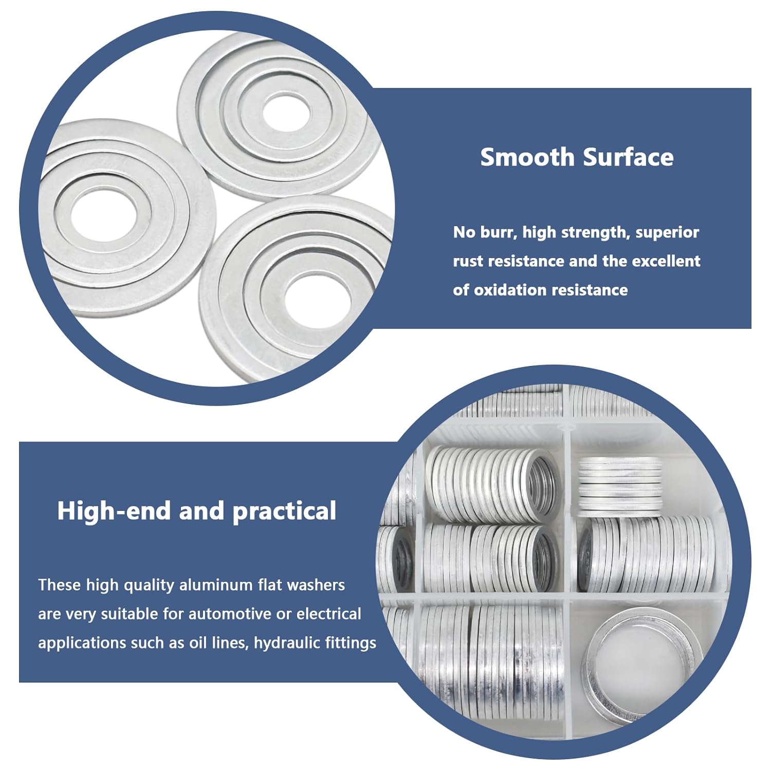 Excellently diverse, this box of washers supplies almost each of the inner diameter washers in two different outer diameters, giving you a choice of wide or narrow sealing surface. Made of relatively soft aluminum, these washers are great for oil drain and fill plugs on vehicles and machinery or for use on case bolts of magnesium housings to prevent galvanic corrosion.