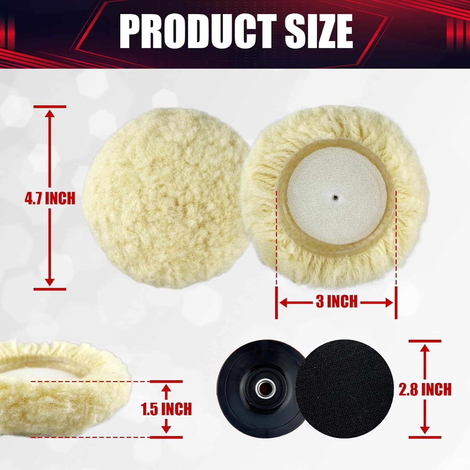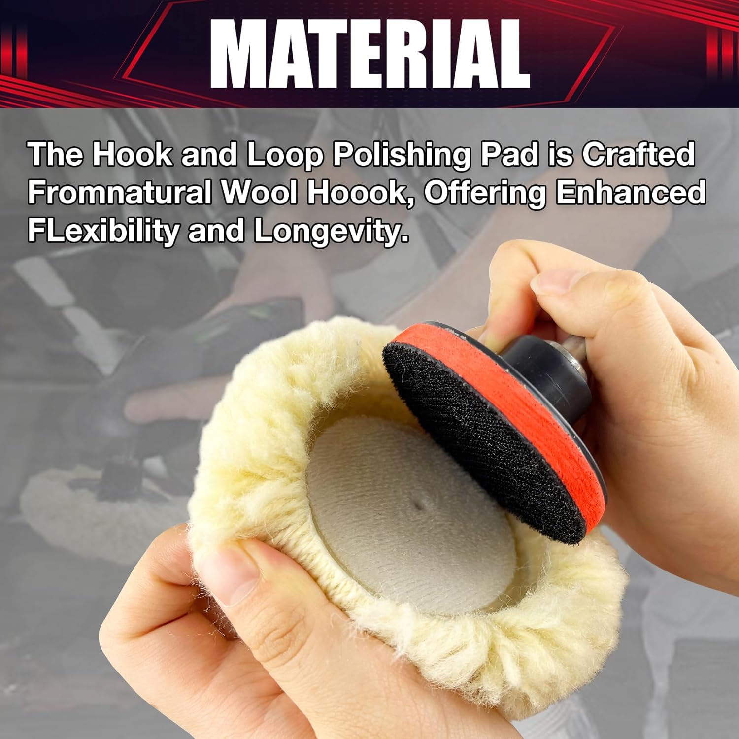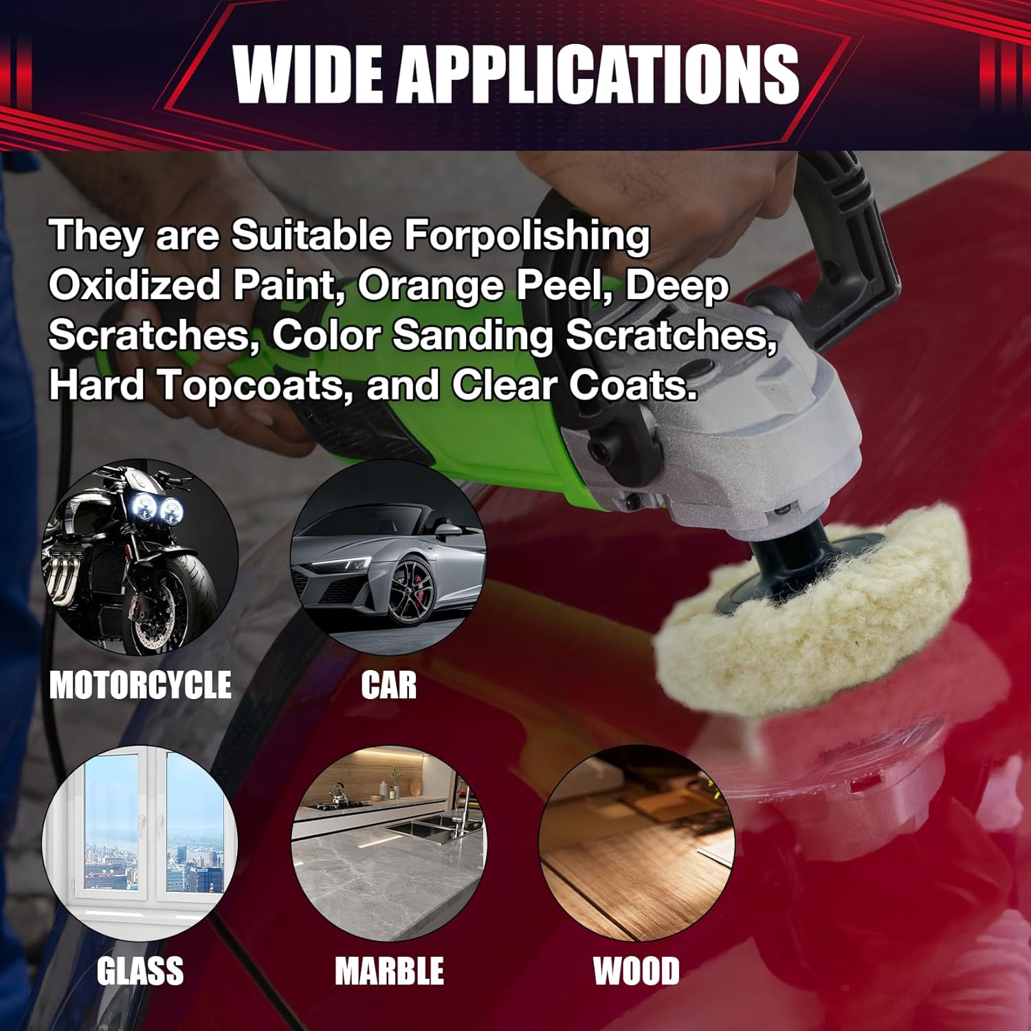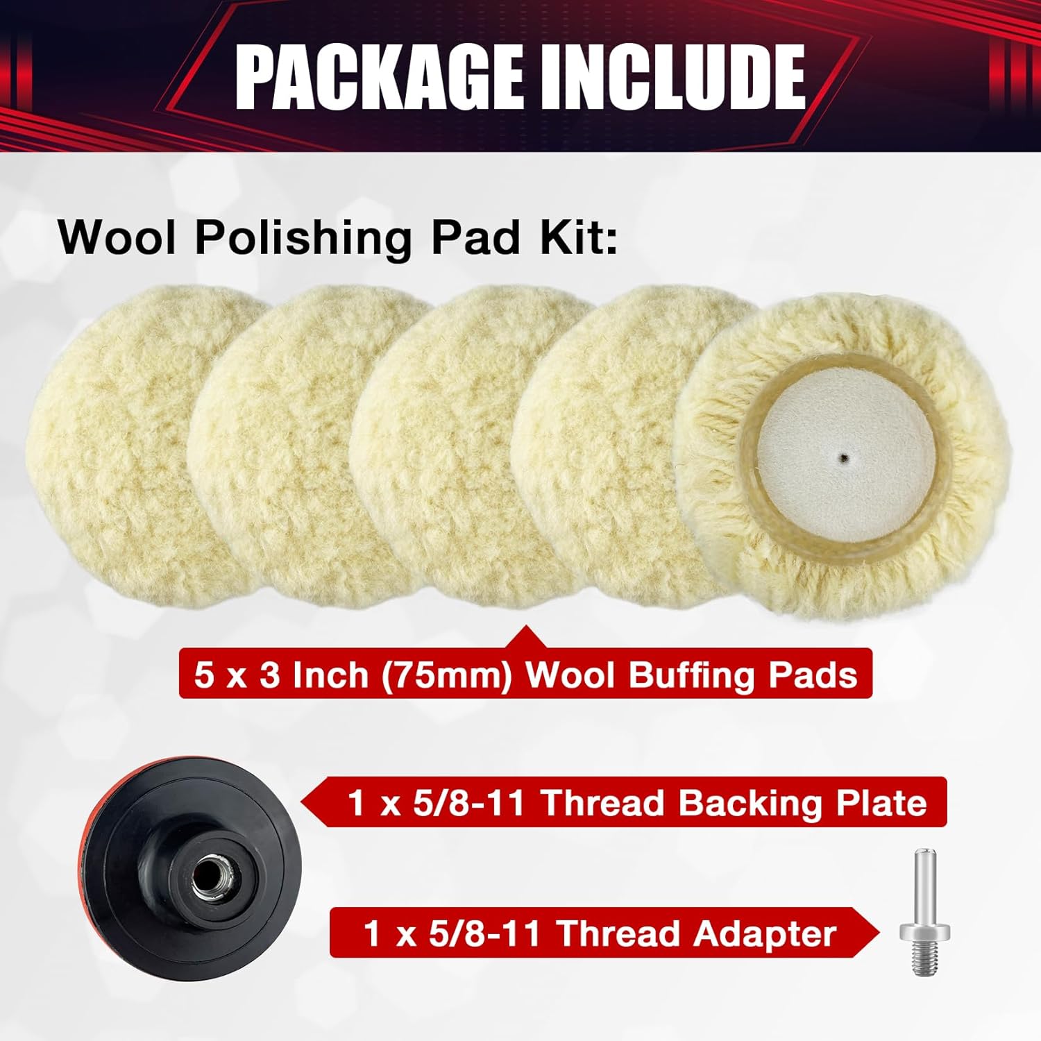 O kit inclui cinco pads de polimento de lã de 3 polegadas (75mm), uma placa de apoio com rosca 5/8-11 e um adaptador de rosca 5/8-11, tornando-o compatível com a maioria das máquinas de polimento pneumáticas e elétricas disponíveis no mercado. Ao utilizar líquidos, pastas ou pós de polimento, a superfície polida alcança um efeito superior, enquanto o pad de lã mantém a estabilidade durante o uso, prevenindo o superaquecimento e minimizando o risco de queima da pintura.