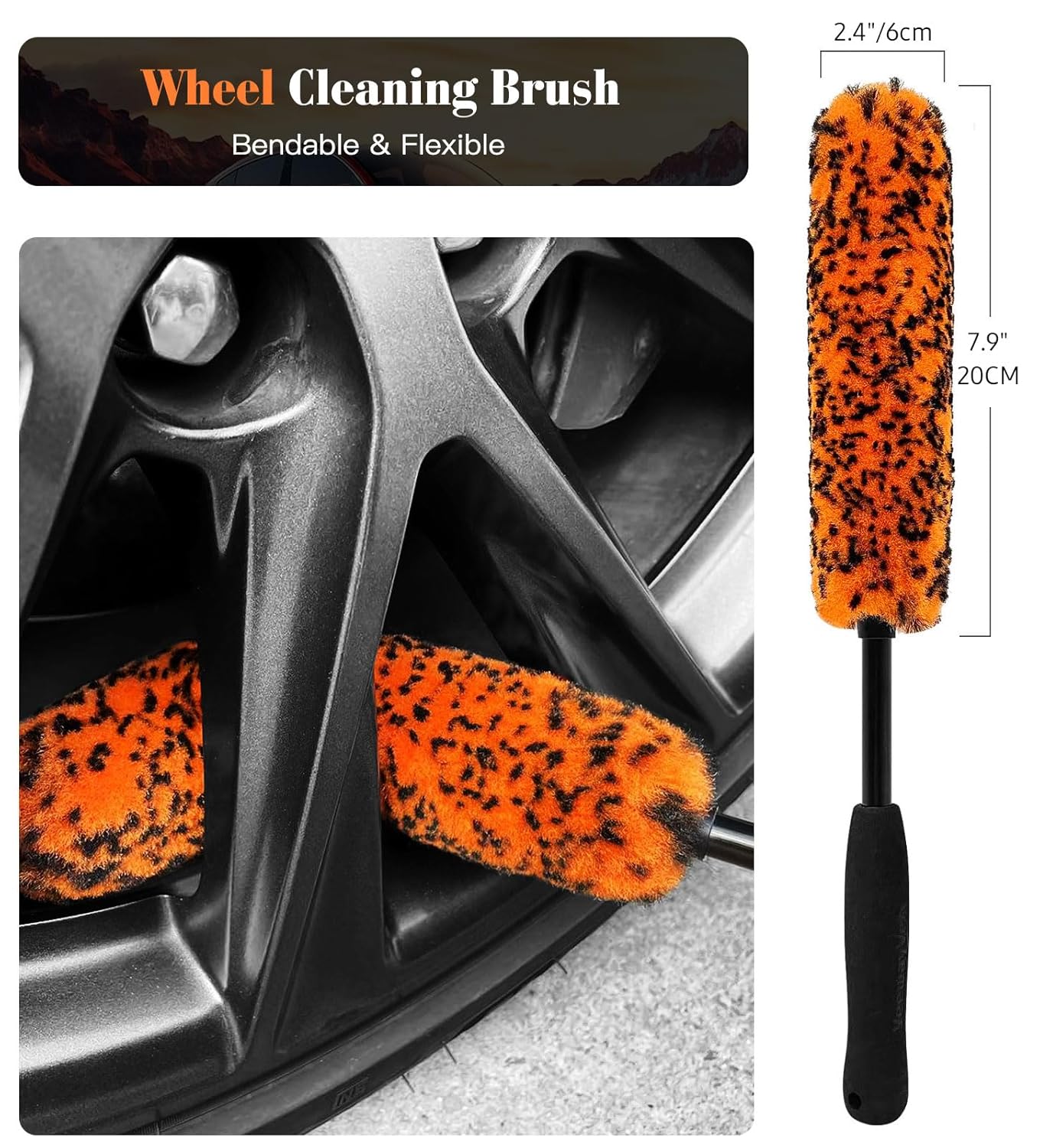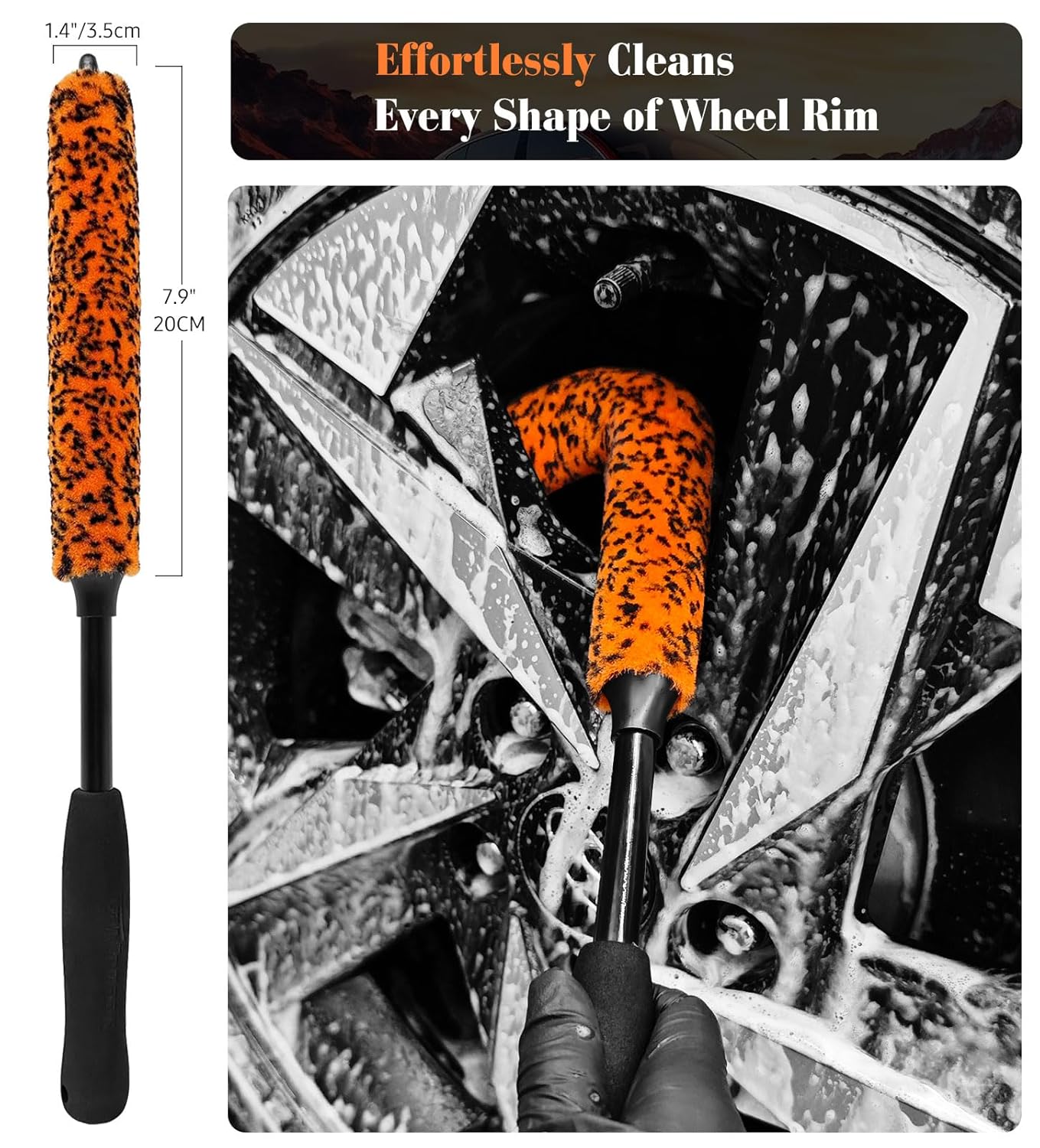 5PCS Car Wheel Cleaning Kit, 2-Size Bendable Wheel Rim Brush,Tire Brush and Car Detailing Brush, Soft & No-Scratch Car Wheel Rim Cleaner Brush Set with Microfiber Towel for All Wheel Types. The microfiber wheel brushes are a tight packed plush and solid feeling except for the fact that the thicker diameter 16” microfiber wheel brush is just falling apart at the end right out of the box. The smaller diameter brush only had a tiny bit but the larger one makes a mess with loose fiber particles just coming off it. I like that I can bend these but wheel cleaning is not a gentle cleaning. There is a lot of grime to clean off and these aren’t going to cut it. The microfiber towel is well made and quite thick but kind of small. It has a hook to hang it which is best as these types of towels perform better if they are hung to dry. The tire brush is well made and the detailing boars hair brush is good but the main thing that attracted me to this kit was the wheel brushes so I’m disappointed in the quality of those.