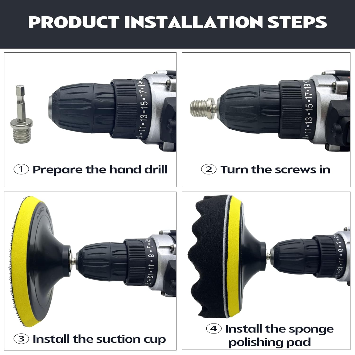 3. Montagem: Conecte a almofada ao adaptador M14 e fixe-o na furadeira ou parafusadeira.
