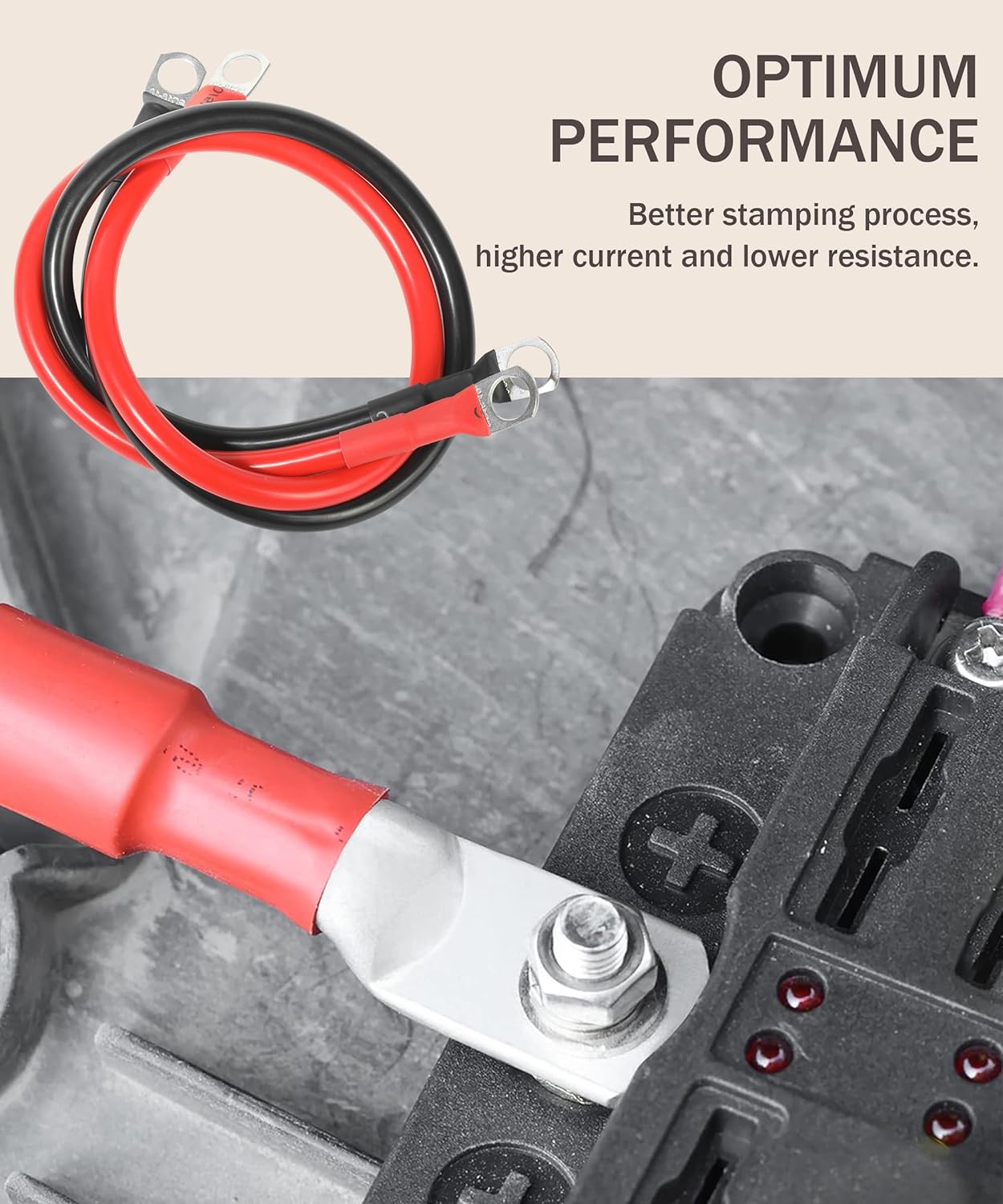 Cada cabo vem equipado com um anel terminal selado com função de encolhimento térmico, já crimpado, facilitando a instalação em dispositivos ou interruptores de desconexão de bateria. Os cabos de especificação 6 são amplamente utilizados em aplicações de energia, como em carros, caminhões, energia solar, trailers, carrinhos de golfe, motocicletas e cortadores de grama, tornando-os versáteis e indispensáveis para qualquer entusiasta de automóveis ou profissional da área.