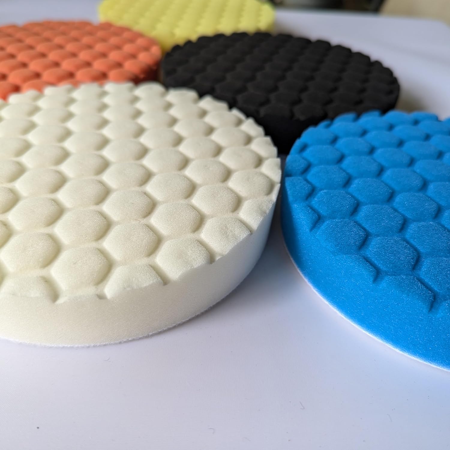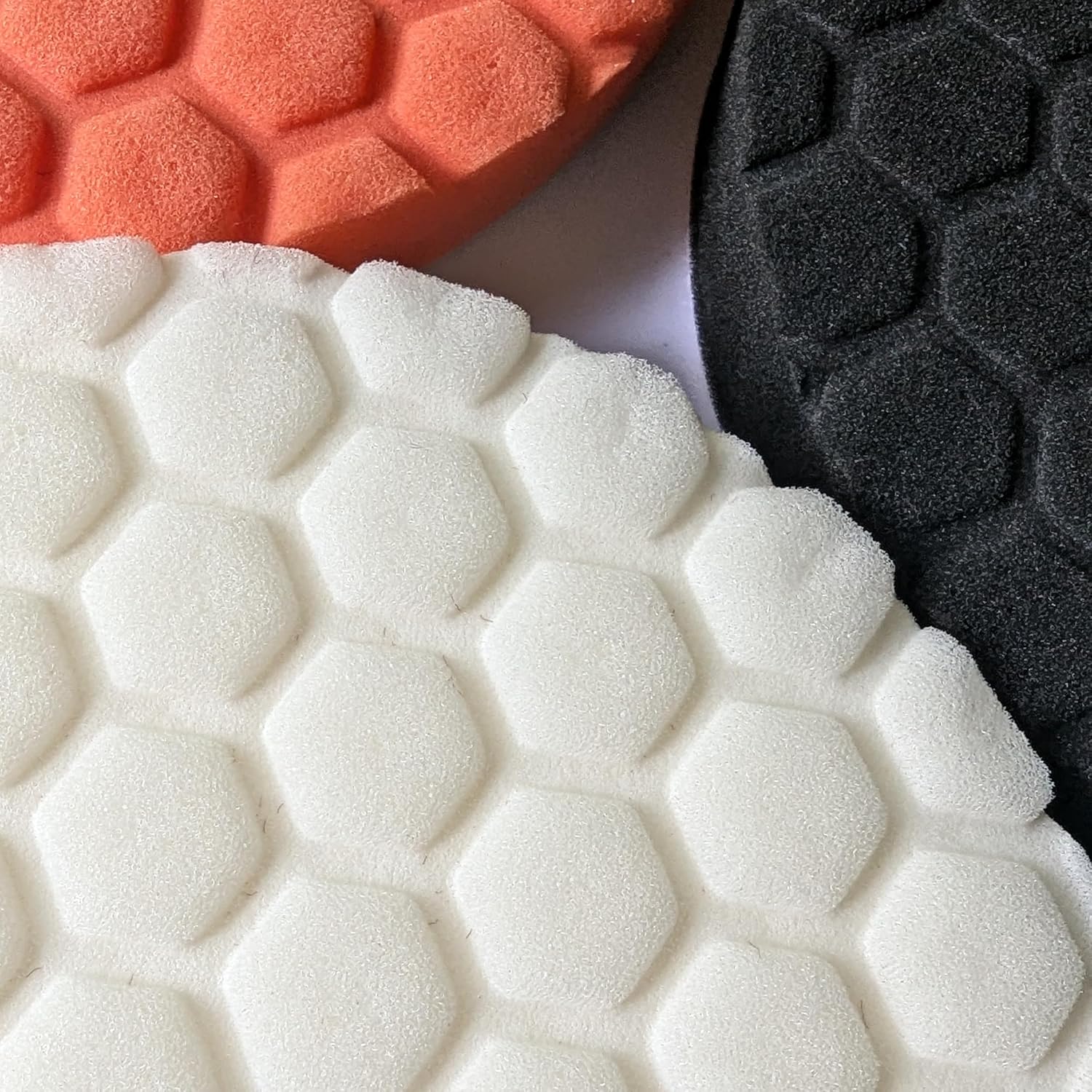 As almofadas brancas e laranjas são perfeitas para a remoção de arranhões, enquanto as almofadas amarelas e azuis são ideais para polimento em uma única etapa. Para o polimento final e aplicação de cera, a almofada preta de acabamento suave garante um brilho excepcional. Cada almofada é feita de espuma durável com um design hexagonal inovador, que reduz o acúmulo de calor e garante uma distribuição uniforme do produto, prolongando a vida útil da almofada e proporcionando um desempenho consistente e duradouro.