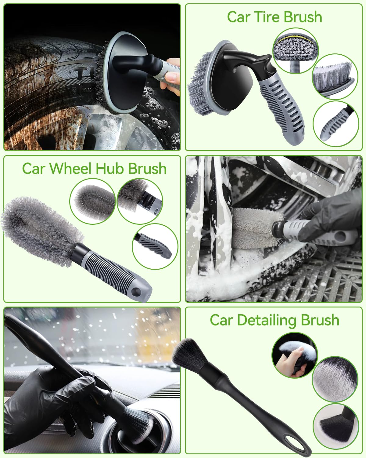 4. Pneus e Rodas: Utilize a escova para pneus e a escova para cubos de roda para limpar essas áreas específicas.