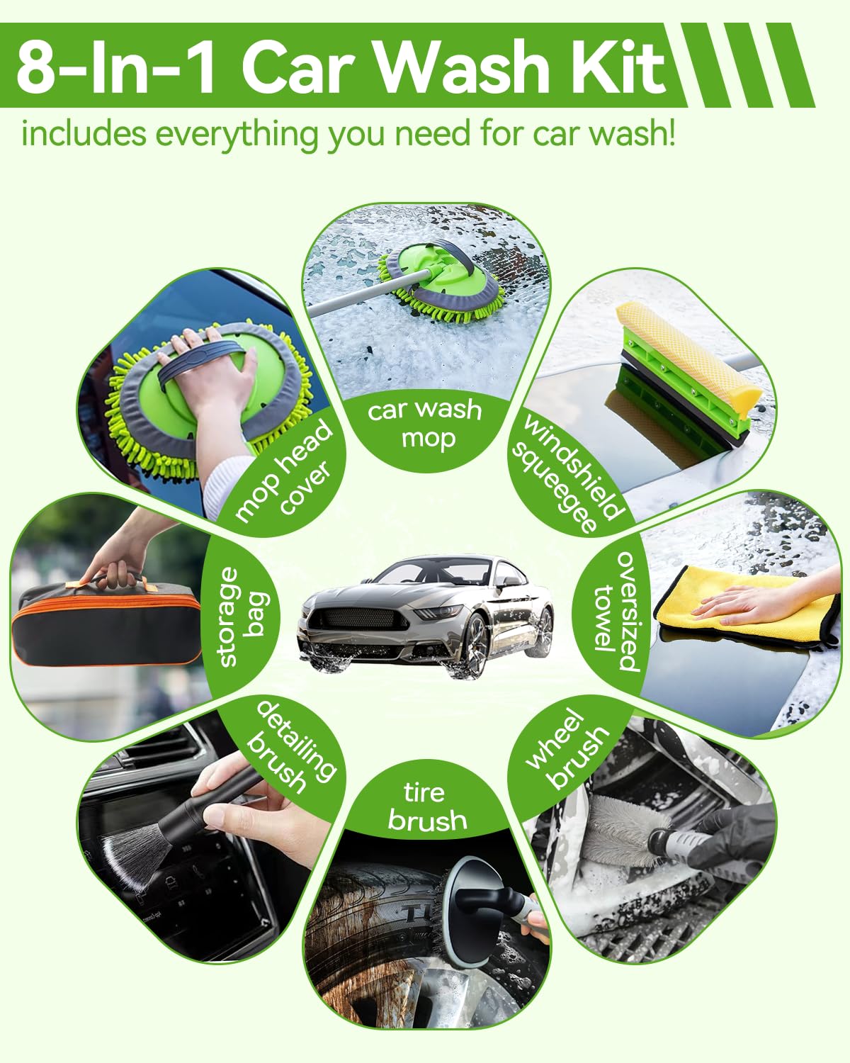 Really nice 8-piece set! I wish they made these when I was younger–gone are the days of using a big sponge! The microfiber mop heads are great on the car–and having a handle keeps your hands nice and dry. The windshield squeegee is really good on our windshield, windows, and moonroof. In addition, the microfiber towel works great at drying and not scratching our SUV. The tire brush (only use on the tire) is good but designed for small cars not SUV tires. The wheel brush is great for the rims and you get a nice storage bag.