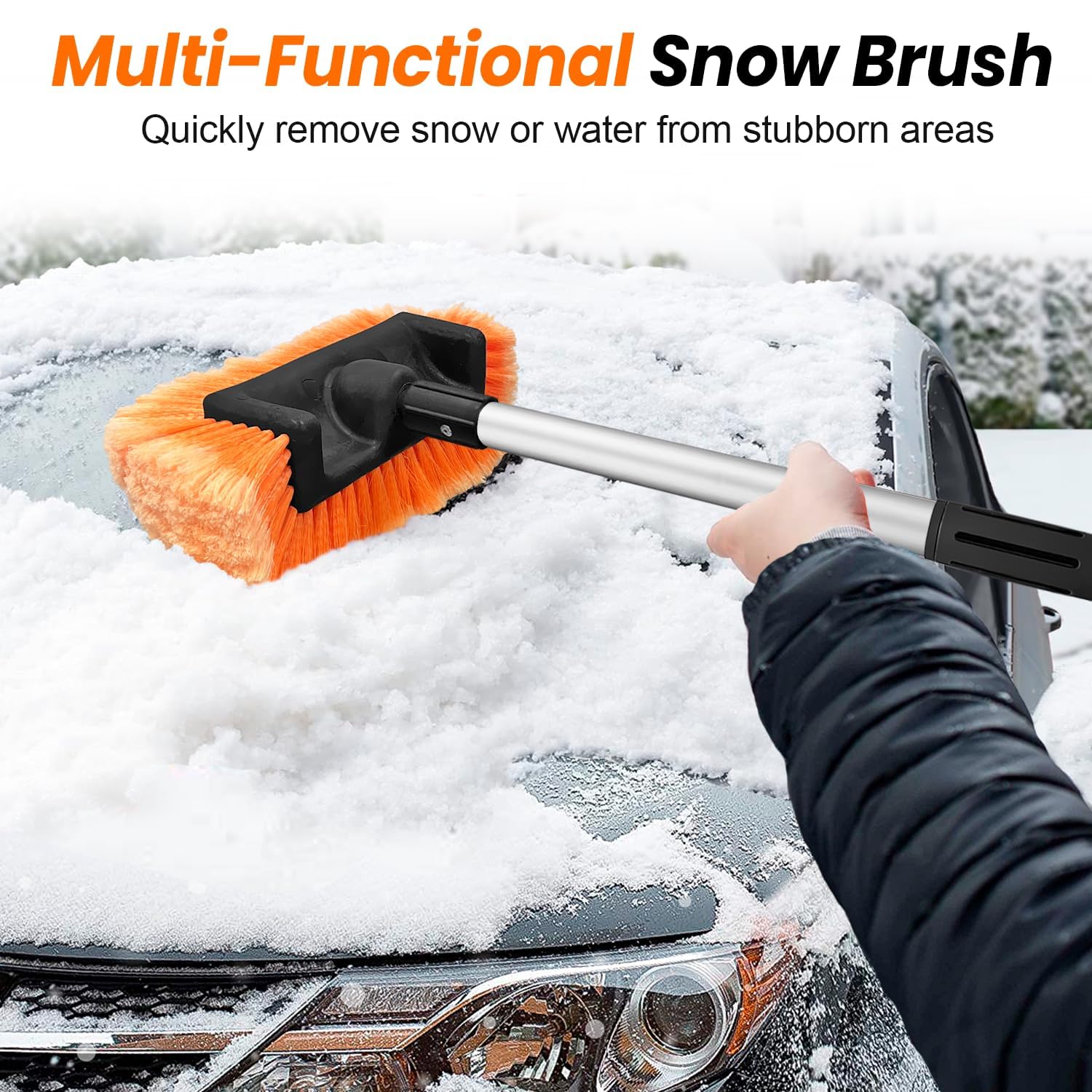 – Escova Multifuncional para Lavagem e Remoção de Neve: Além de ser perfeita para a lavagem de carros, a cabeça da escova também é ideal para remover neve ou água de áreas difíceis durante o inverno. As cerdas espessas e macias do vassourão de neve permitem que você remova rapidamente a neve, protegendo a pintura do seu carro ao mesmo tempo.
