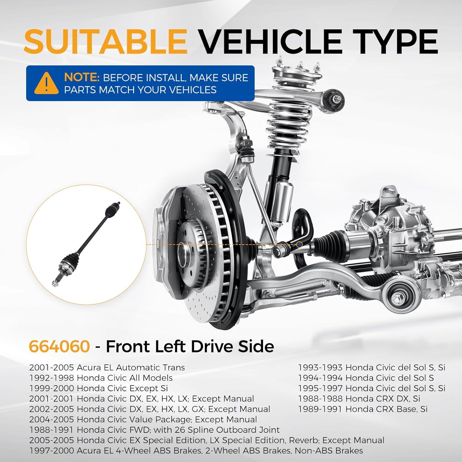 Compatibilidade: O Conjunto de Eixo CV 664060 é compatível com Acura EL que possuem freios ABS de 4 rodas, freios ABS de 2 rodas e freios não ABS, além de ser adequado para transmissões automáticas. Para o Honda Civic, ele se adapta a diversas versões, incluindo Civic DX, EX, HX, LX e Civic del Sol S e Si, exceto modelos manuais.