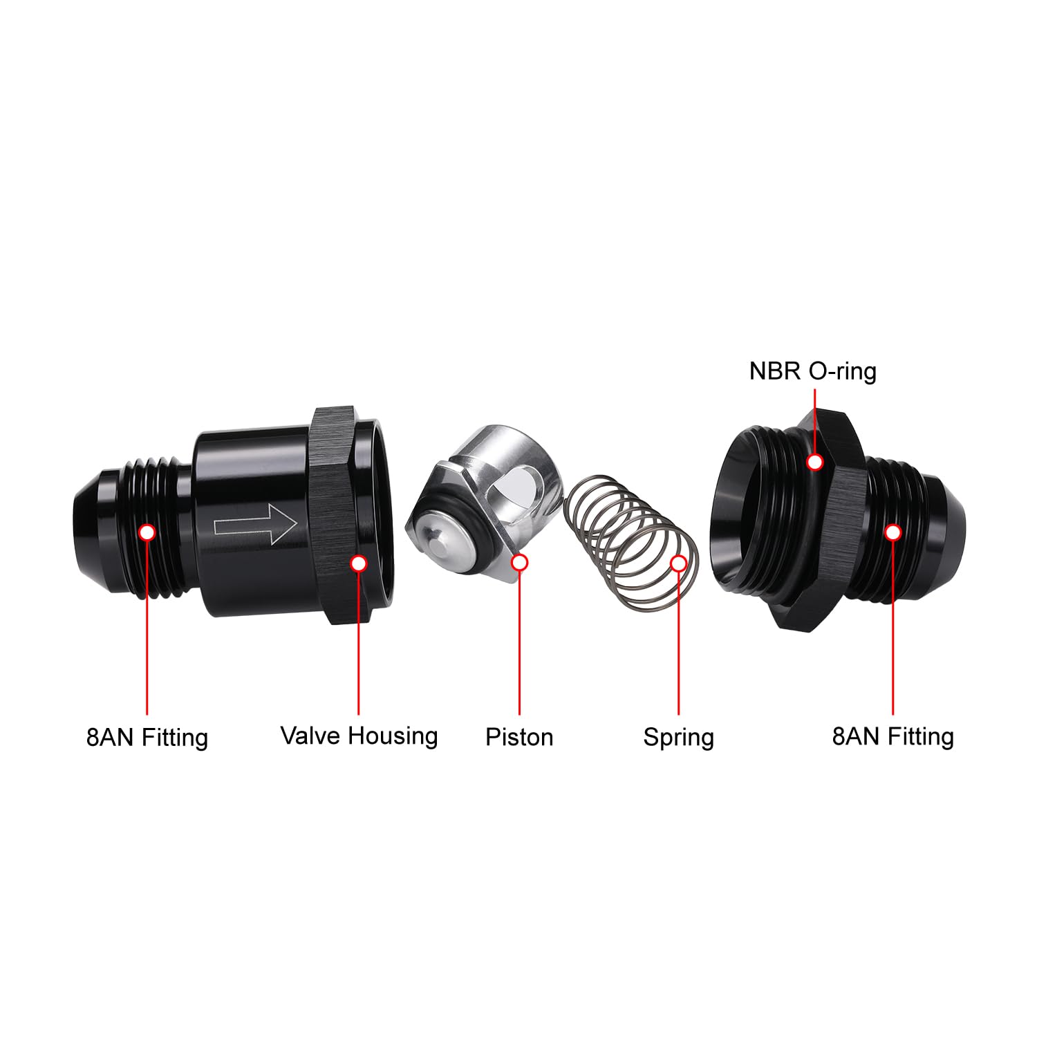 Com uma pressão de abertura de 1,5 PSI e uma pressão máxima de 1.500 PSI, a válvula é capaz de suportar condições extremas, tornando-se uma escolha confiável para quem busca eficiência e segurança. O encaixe de entrada e saída é do tipo AN6 (9/16-18 UNF), com um comprimento de habitação de aproximadamente 29 mm (excluindo os encaixes de entrada/saída). Este produto é compatível com uma ampla gama de fluidos, incluindo combustíveis, óleo, refrigerante, ar, diesel, metanol, etanol e E85, o que o torna versátil para diversas aplicações automotivas e industriais.