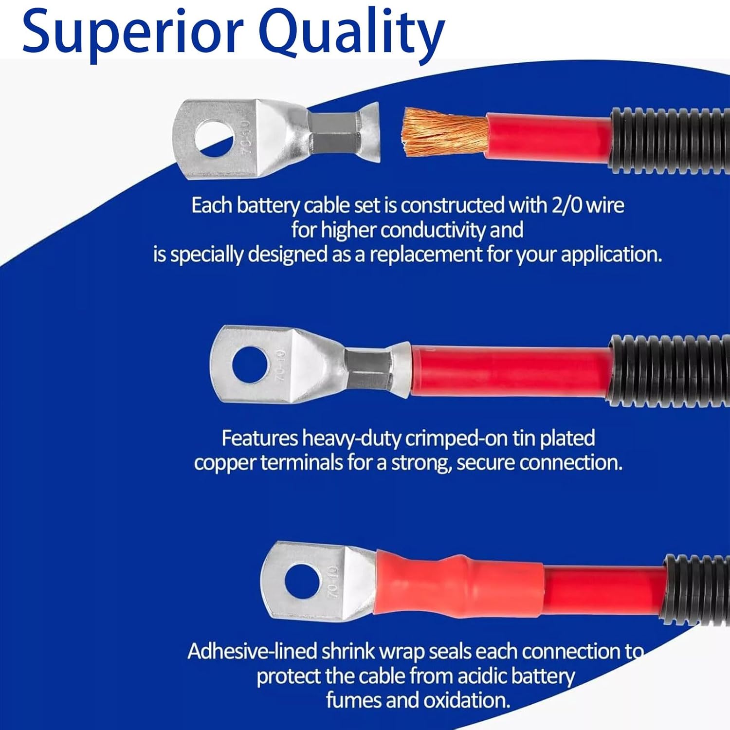 – Cada conjunto de cabos de bateria é construído com fios de 2/0 para maior condutividade e é projetado especificamente como substituição para sua aplicação. Os terminais de cobre estanhado, crimpados e de alta resistência garantem uma conexão forte e segura. O envoltório termorretrátil adesivo protege cada conexão contra vapores ácidos da bateria e oxidação.