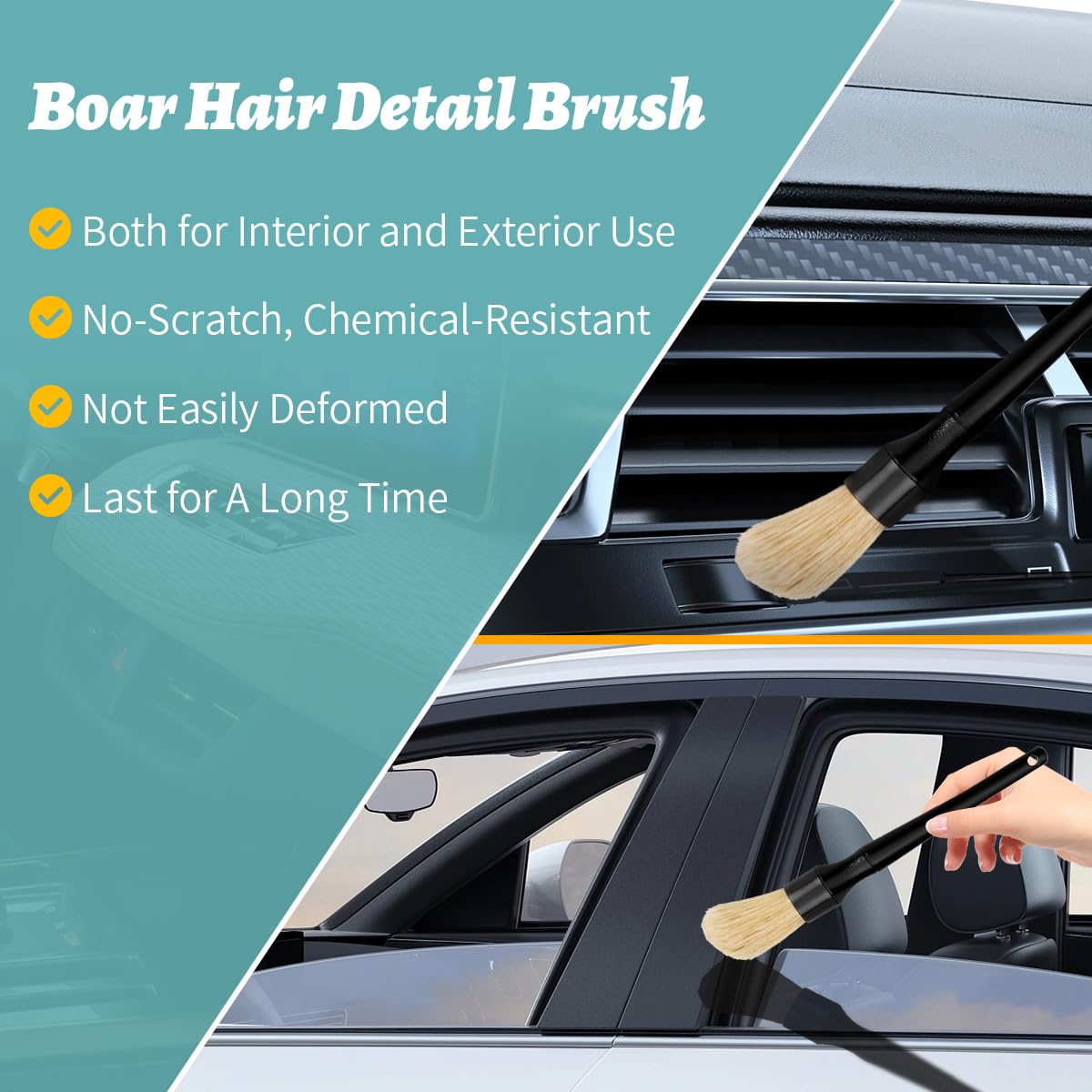 – Limpeza Multifuncional: As 2 escovas amarelas de cerdas de javali são perfeitas para a limpeza do exterior do carro, incluindo rodas e outras partes expostas. As 2 escovas multicoloridas são versáteis, adequadas tanto para o interior quanto para o exterior do veículo. As 2 escovas pretas de cerdas sintéticas super macias são ideais para limpar o painel e os bancos de couro, alcançando até os cantos mais difíceis. Além disso, a escova para estofados é uma ferramenta multifuncional para a limpeza interna.
