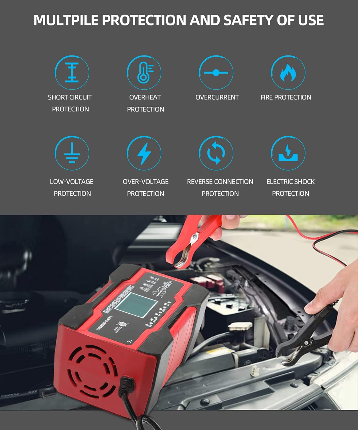 – [Reparo de Pulsos de Alta Eficiência] O carregador possui um sistema de controle inteligente que detecta automaticamente a sulfatação e estratificação ácida da bateria. A função de reparo por pulso ajuda a restaurar o desempenho perdido da bateria, proporcionando partidas mais fortes e prolongando sua vida útil.