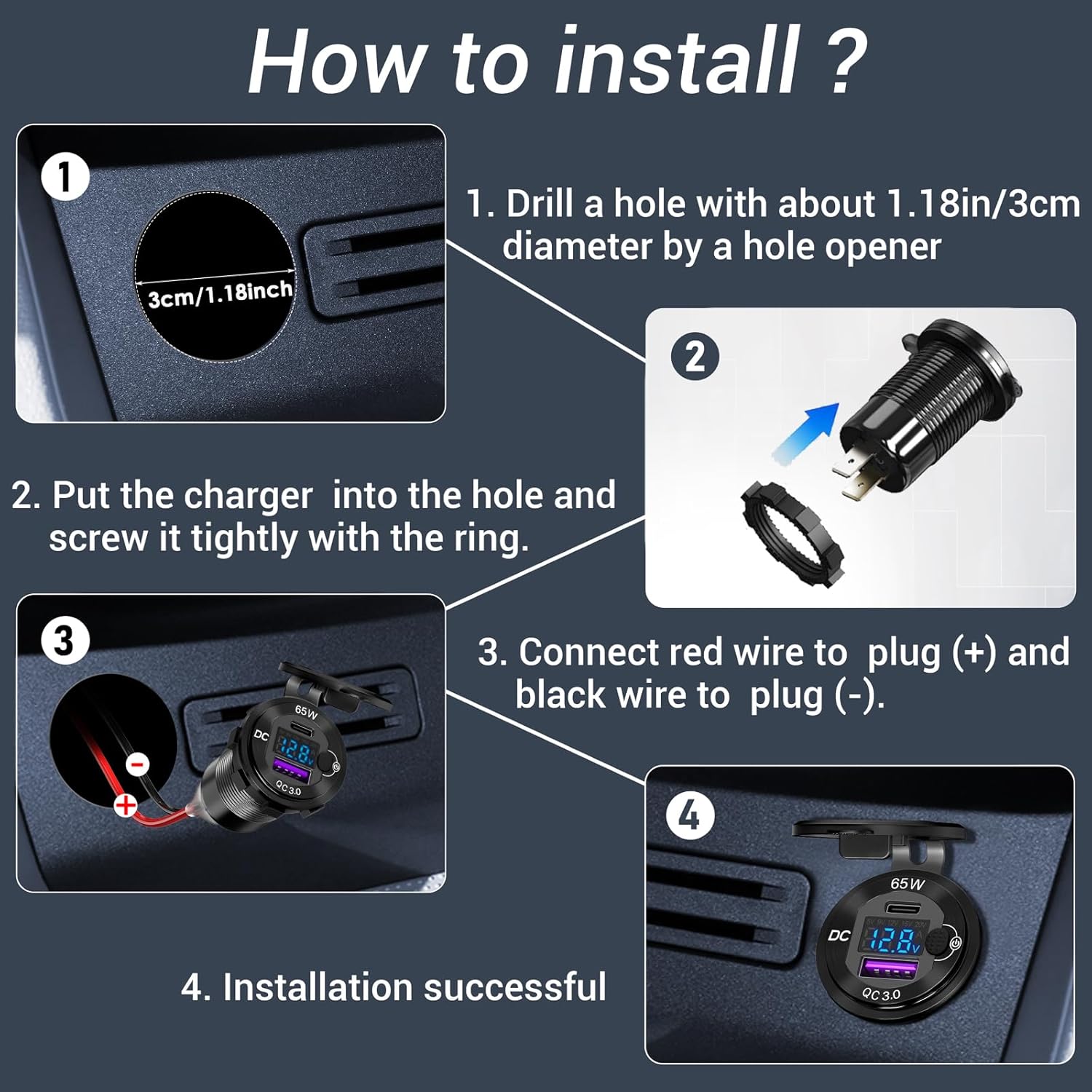 A instalação do Carregador Ouffun é simples e rápida. Basta perfurar um buraco redondo de 1 1/8 de diâmetro com uma broca padrão, inserir o produto e apertar o anel de parafuso. Conecte o terminal positivo do produto ao terminal positivo da fonte de energia e o terminal negativo ao terminal negativo da fonte ou ao override, e você estará pronto para começar a carregar.
