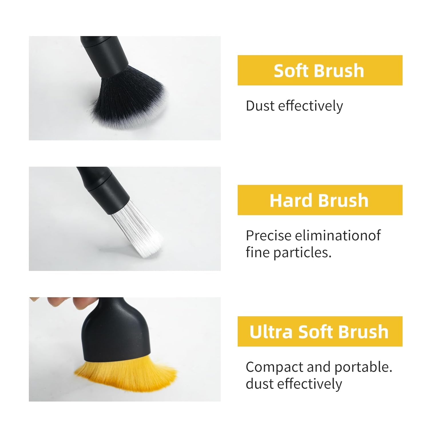 Este conjunto inclui uma escova ultra macia amarela, projetada com cerdas premium e um cabo ergonômico, ideal para superfícies sensíveis como painéis e bancos de couro. As escovas de cerdas de javali são perfeitas para a limpeza profunda de fendas microscópicas e manutenção delicada de eletrônicos.