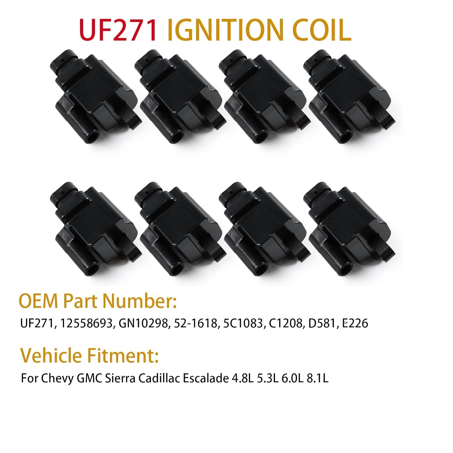 O Pacote de 8 Bobinas de Ignição UF271 é a solução ideal para quem busca desempenho e confiabilidade em veículos da linha Chevy e GMC, incluindo modelos como Silverado, Sierra, Avalanche, Suburban e Cadillac Escalade, com motores de 4.8L, 5.3L, 6.0L e 8.1L. Com o número de peça UF271 12558693 GN10298 52-1618 5C1083 C1208 D581 E226, é fundamental verificar a compatibilidade com seu veículo antes da compra para garantir um ajuste perfeito.