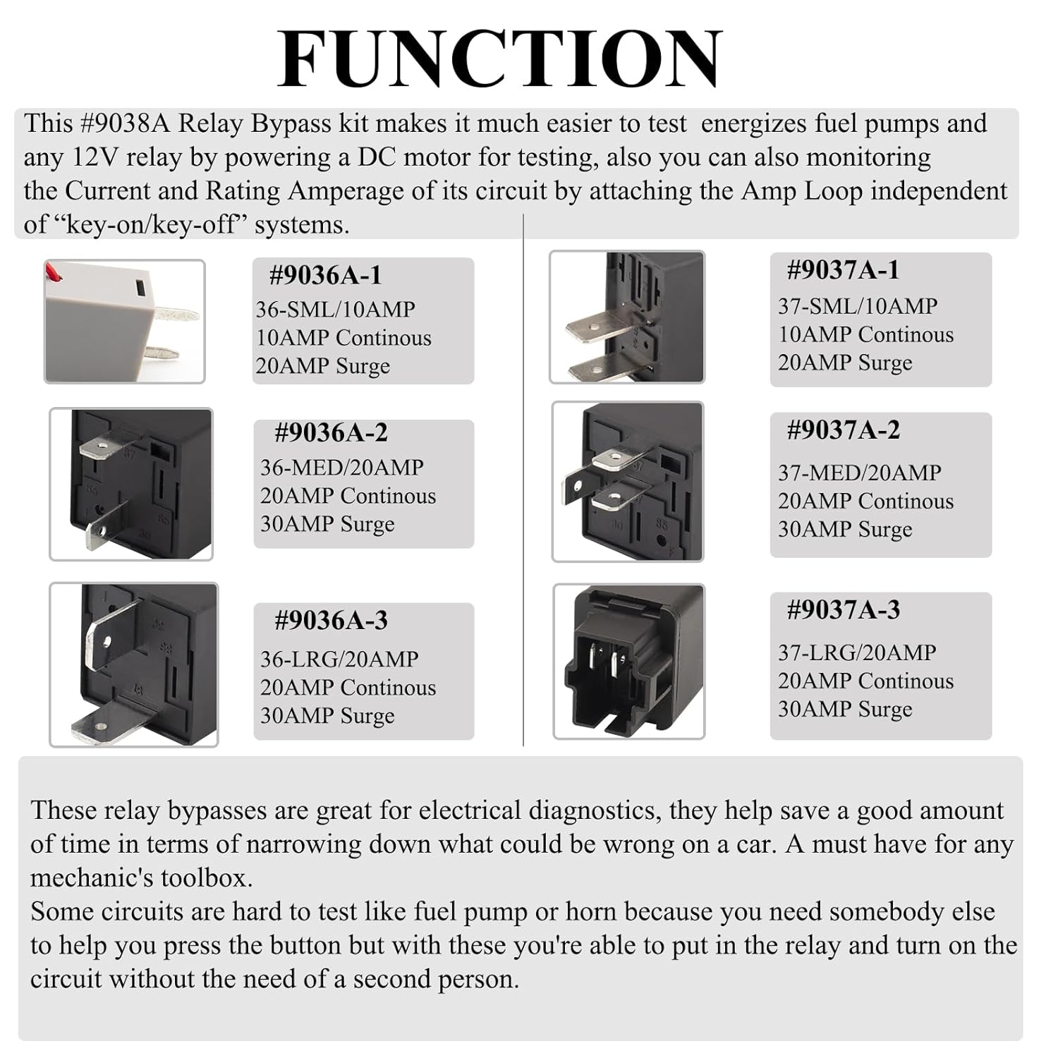 O 9038A Relay Tester Diagnostic Scan Tool Fuel Pump Relay Bypass Master Kit with Amp Loop é uma ferramenta indispensável para profissionais e entusiastas da mecânica automotiva. Este kit de bypass de relé foi projetado para facilitar a testagem de componentes cruciais do veículo, como bombas de combustível, ventiladores de refrigeração, ventoinhas e motores de janela. Com a adição do amp loop, é possível monitorar a corrente e a amperagem nominal do circuito, garantindo um diagnóstico preciso e eficiente.