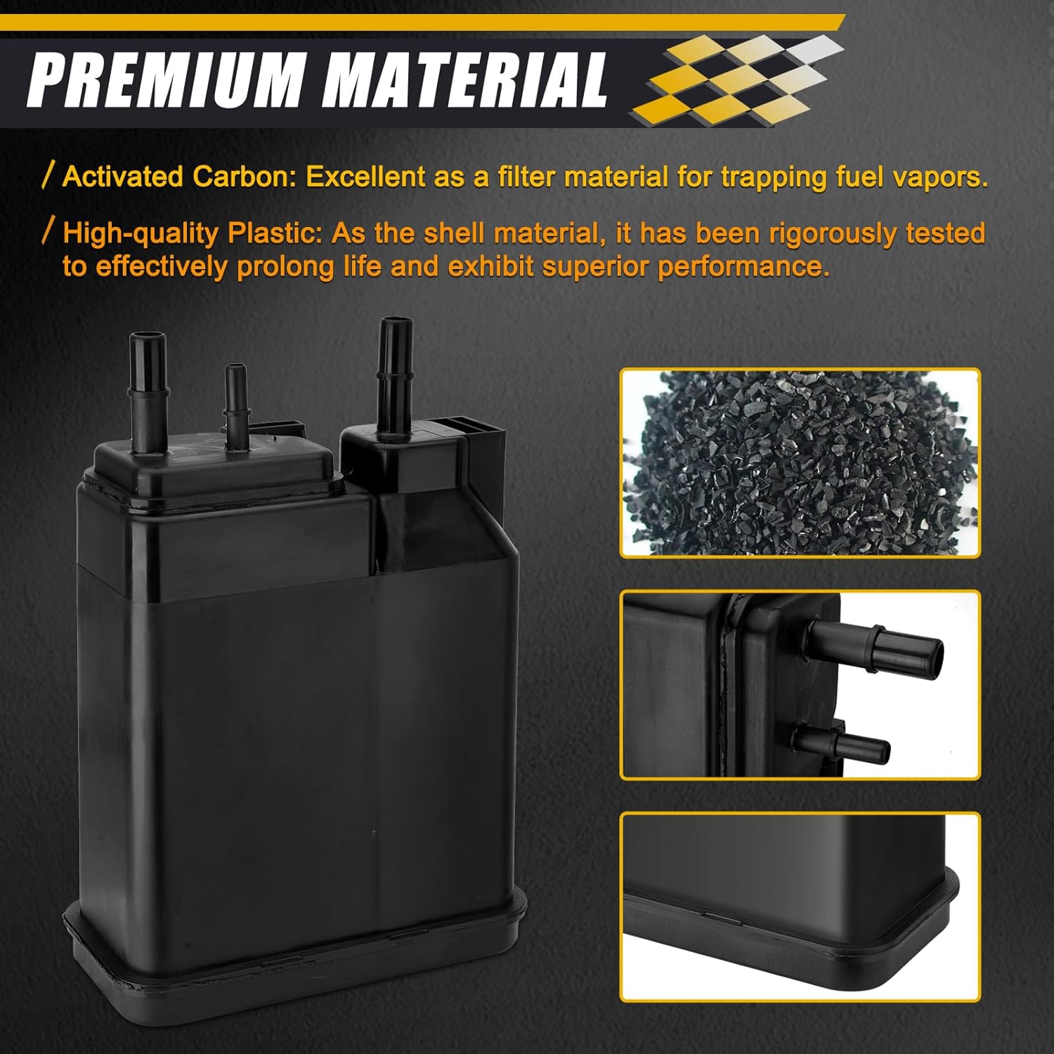 – Material Premium: Carvão ativado para captura de vapores de combustível e plástico de alta qualidade para a carcaça.