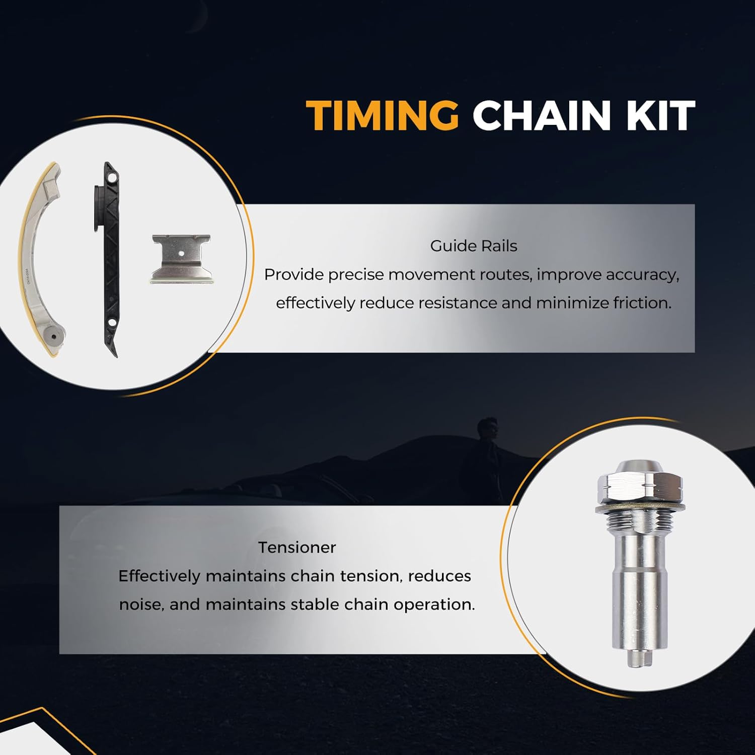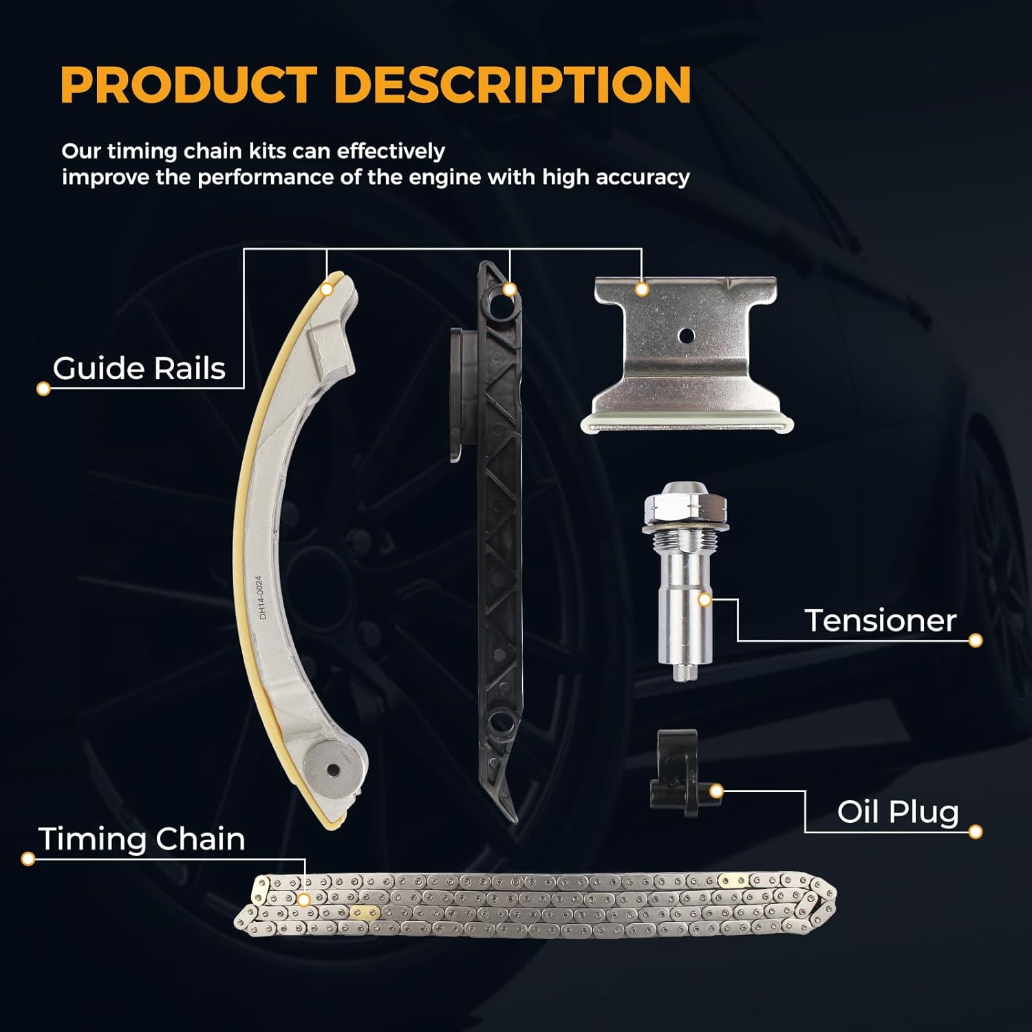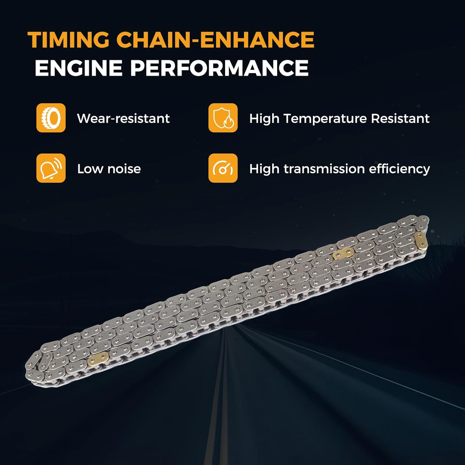 Função: A corrente de distribuição sincroniza o comando de válvulas e o virabrequim, permitindo que as válvulas se abram e fechem no momento certo durante a operação do motor. A corrente de distribuição do motor pode produzir ruídos característicos de batidas devido ao desgaste; a maioria dos ruídos é normal, mas os excessivos exigem uma inspeção. Devido à natureza crítica e complexa do tempo do motor, a instalação profissional é altamente recomendada.