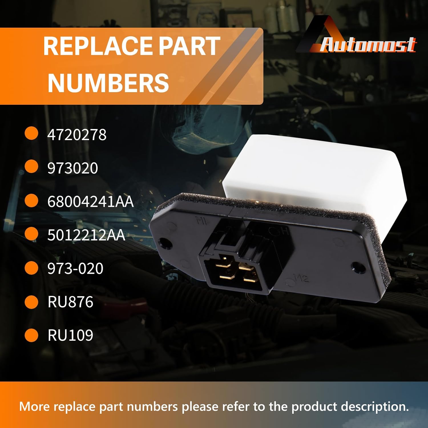 - [Compatibilidade]: Este resistor do motor do ventilador é compatível com o Dodge Ram 1500 Pickup (1994-2009), Ram 2500 Pickup (1994-2009), Ram 3500 Pickup (1994-2009) e Jeep Grand Cherokee (1993-1999). Ele substitui os números de peça RU109, 973020, 4720278, 68004241AA, 6800459AA, 5012212AA.