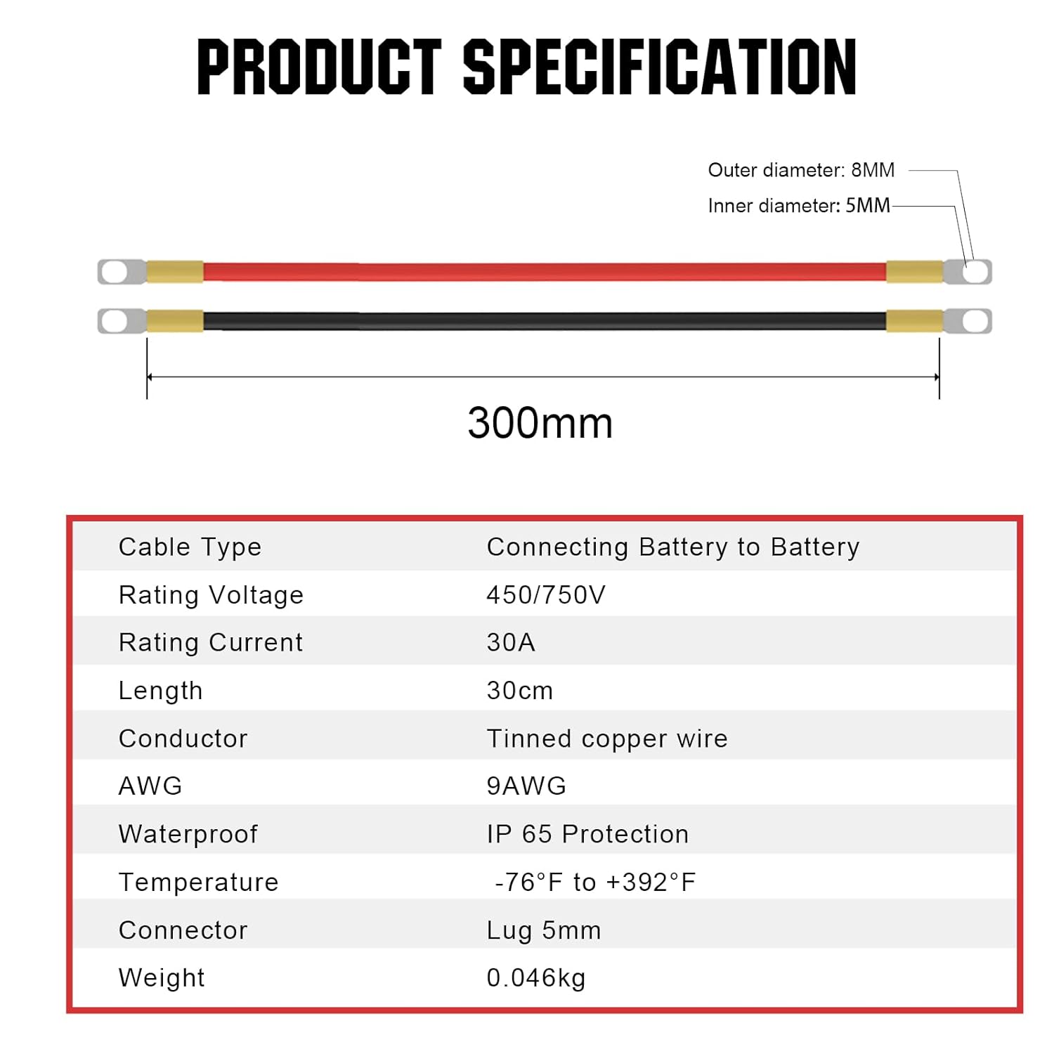 They’re well made. The lugs are plated copper (I filed an edge), and they are cleanly crimped under the heat shrink. They are stiff, as you might expect looking at the drawing showing fewer larger strands in the cable. If you need (or want) more flexible cabling, consider welding cable, but be prepared to pay more. The cable is not marked the way you might expect for US made cable (or cable more target for the US market), so you’re on your own deciding whether it meets the necessary standards. The listing says 5/16 -M8 in the header, then references 3/8 in the description. It’s 5/16 – M8. This is an easy way to connect an inverter to a battery, or to parallel a pair of batteries, especially if you don’t have access to the necessary crimping tools. One star off for the lack of standards marking.