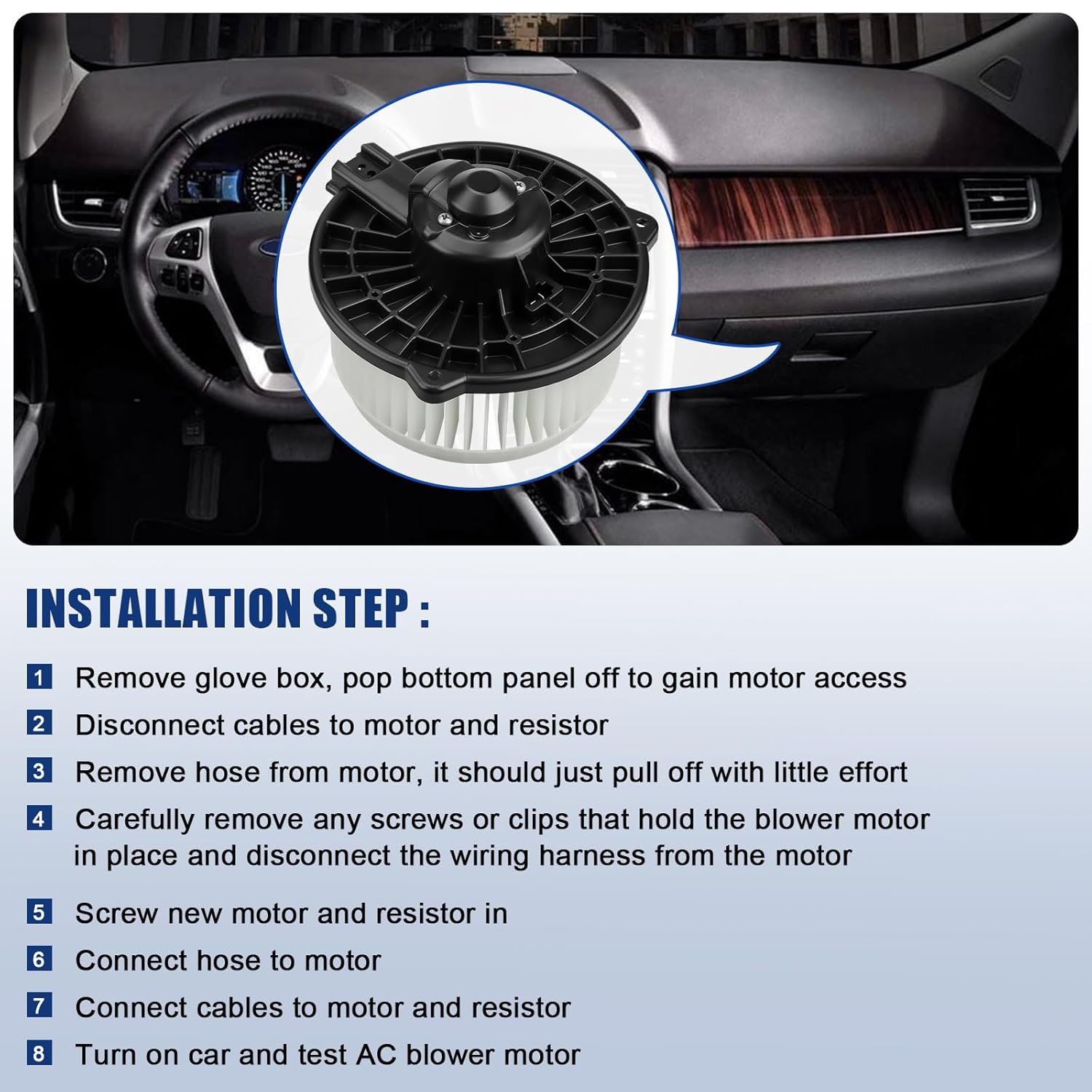 - [Função]: Substituição do Motor do Ventilador do Ar Condicionado – O motor do ventilador do aquecedor A/C é o componente que movimenta o ar aquecido ou resfriado através das aberturas do painel, de acordo com as configurações do sistema de ar condicionado e a velocidade do ventilador selecionada. Se o seu sistema HVAC estiver apresentando problemas como fluxo de ar fraco ou inexistente, ou fazendo barulhos altos de rangido ou batidas, é hora de substituir o motor do ventilador do seu carro.