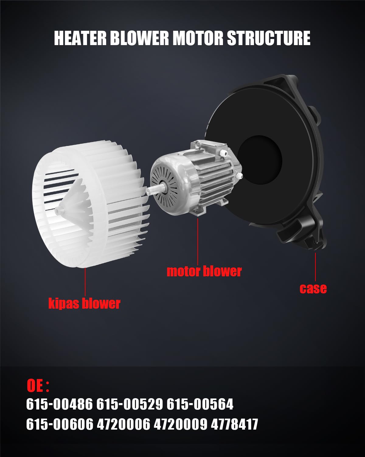 - [REQUIRIR SUBSTITUIÇÃO EM CASO DE] —- 1. Baixo volume de ar no ventilador do veículo ou vento não perceptível, causando superaquecimento no verão ou incapacidade de sentir calor no inverno; 2. Motor preso em uma velocidade; 3. Danos nas lâminas; 4. Entrada de água na entrada de ar, atraindo uma amperagem mais alta, causando superaquecimento e queima da unidade de controle; 5. Cheiro forte dentro do carro.