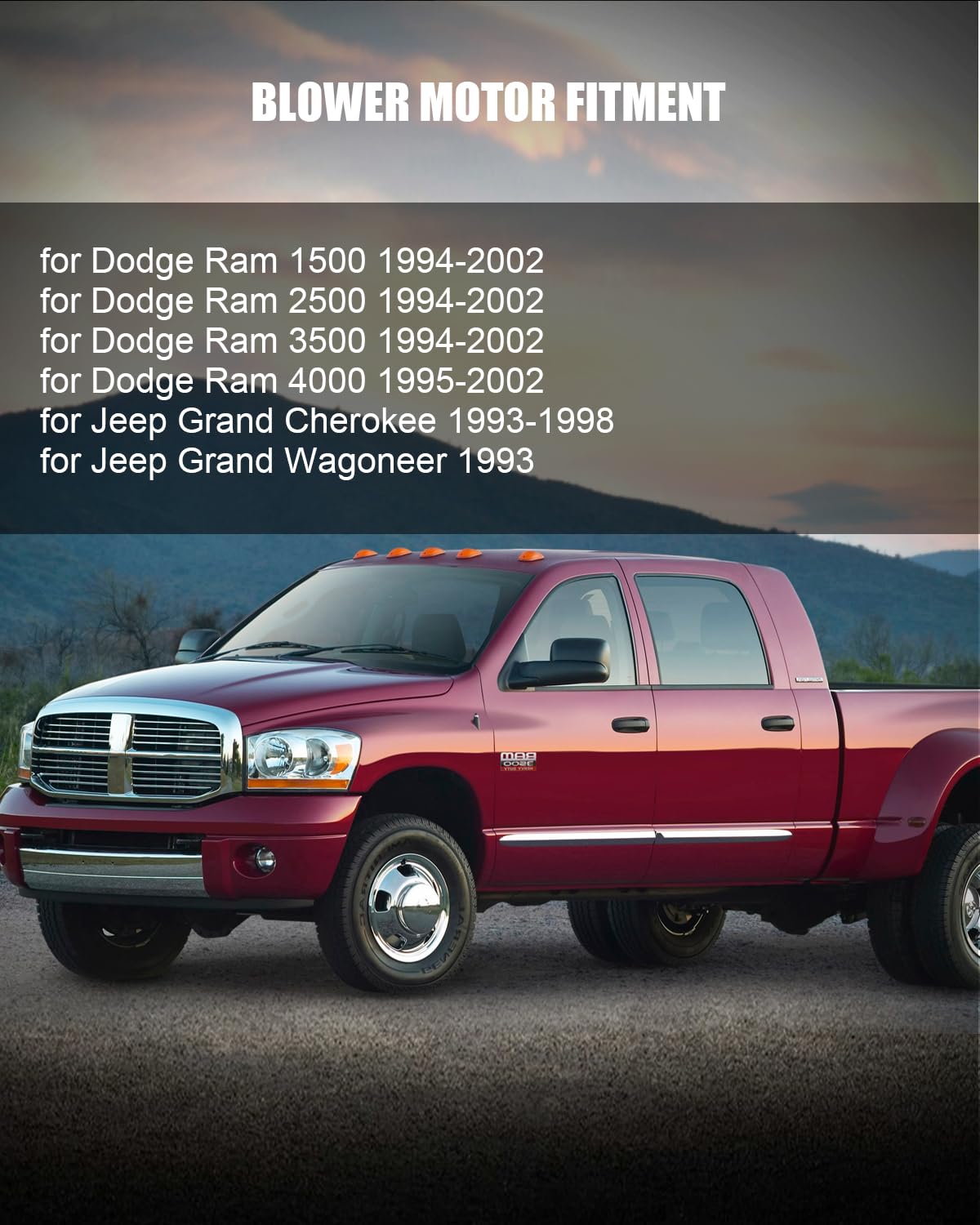 - [COMPATIBILIDADE] —- O Ventilador do Motor do Aquecedor de Ar Condicionado é compatível com Dodge Ram 2500 (1994-2002), Dodge Ram 4000 (1995-2002), Jeep Grand Wagoneer (1993), Dodge Ram 3500 (1994-2002), Jeep Grand Cherokee (1993-1998) e Dodge Ram 1500 (1994-2002).