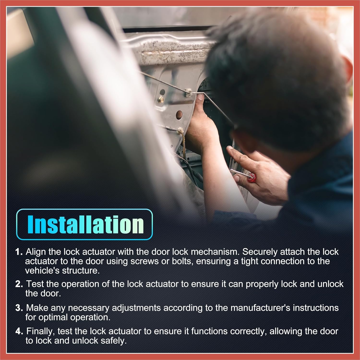 - Acessórios para Carros: Fácil de instalar: 1. Alinhe o atuador de travamento com o mecanismo de travamento da porta. 2. Prenda o atuador à porta usando parafusos ou porcas, garantindo uma conexão firme à estrutura do veículo. 3. Teste a operação do atuador para garantir que ele possa travar e destravar a porta corretamente. 4. Faça os ajustes necessários de acordo com as instruções do fabricante.