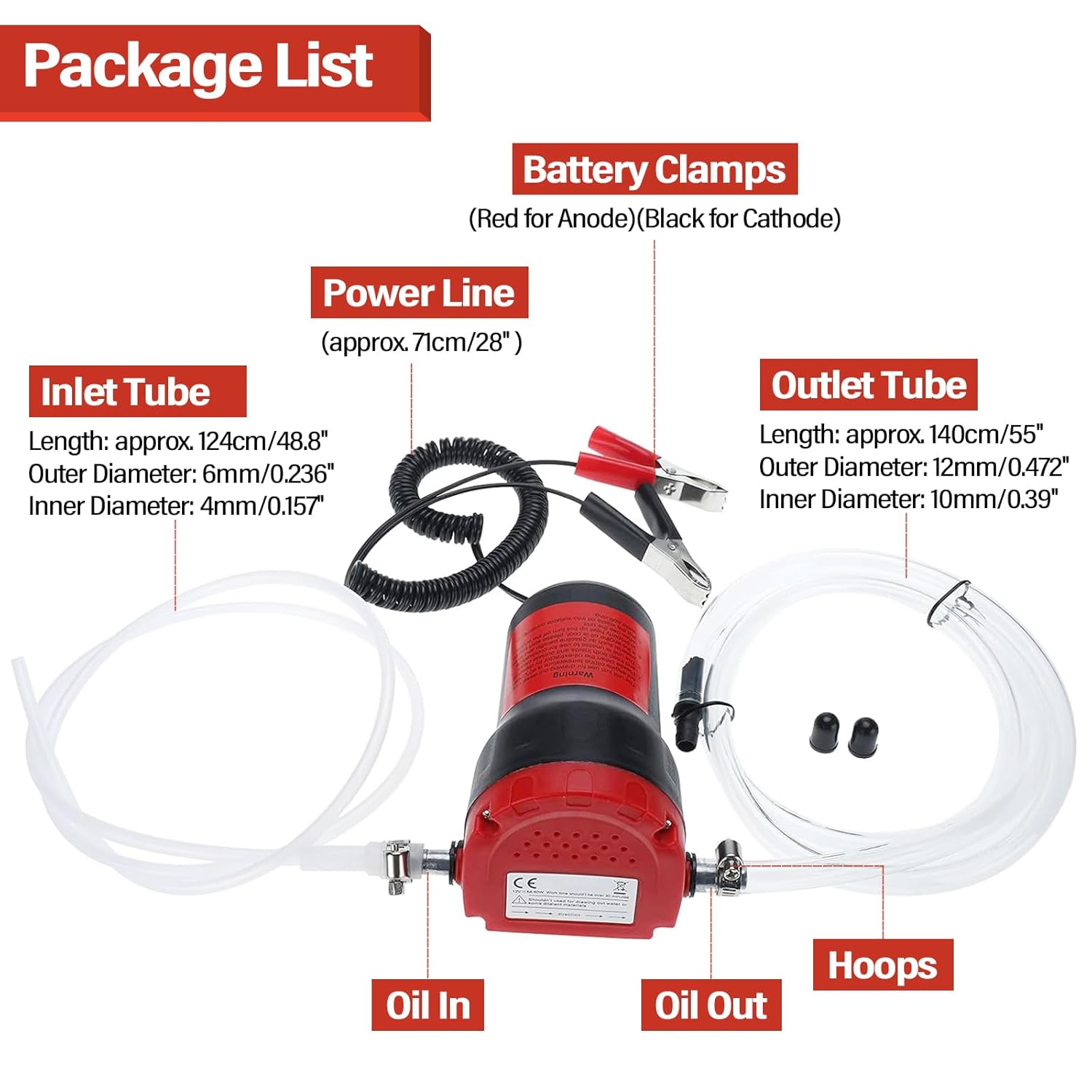 Acessórios Inclusos: O conjunto da bomba de transferência de óleo diesel inclui a bomba de troca de óleo, uma mangueira de saída de 1,5 metros, uma mangueira de entrada de 1,2 metros, 2 travas para mangueiras e 2 clipes de bateria, oferecendo tudo o que você precisa para uma operação completa.