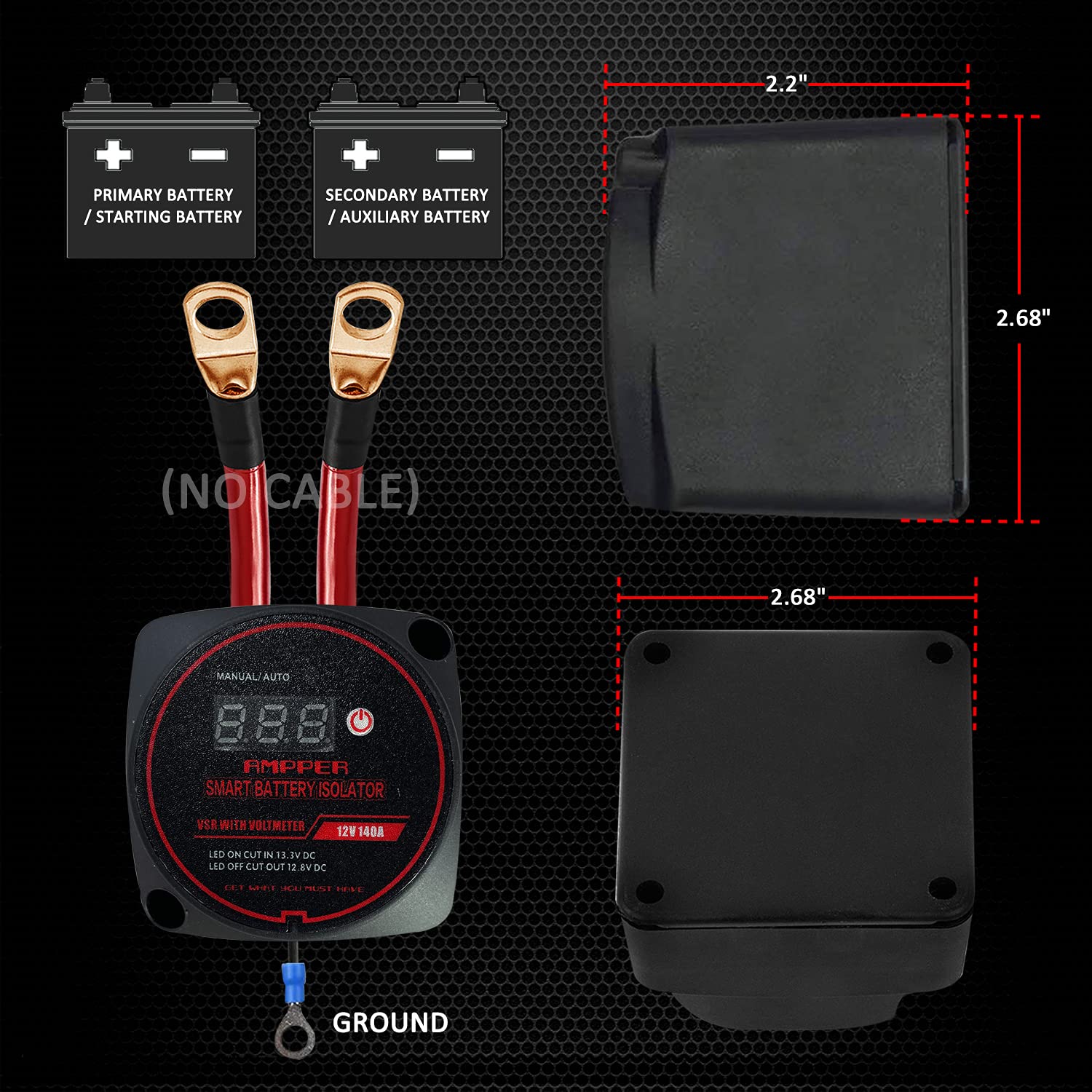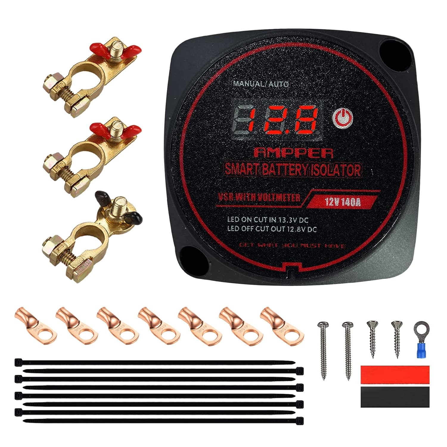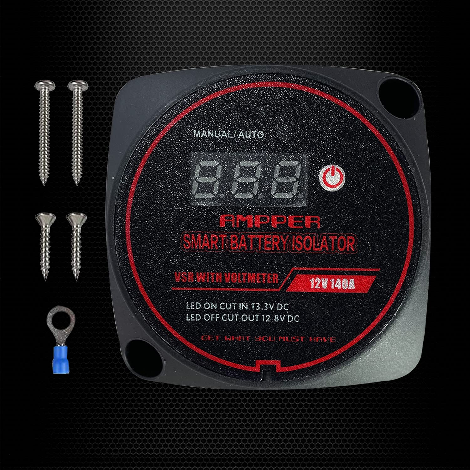 Ampper Isolador de Bateria 12V 140Amp com Relé Sensível à Voltagem (VSR), Voltmêtro e Botão de Controle Manual para Carros e Outros Veículos